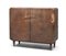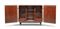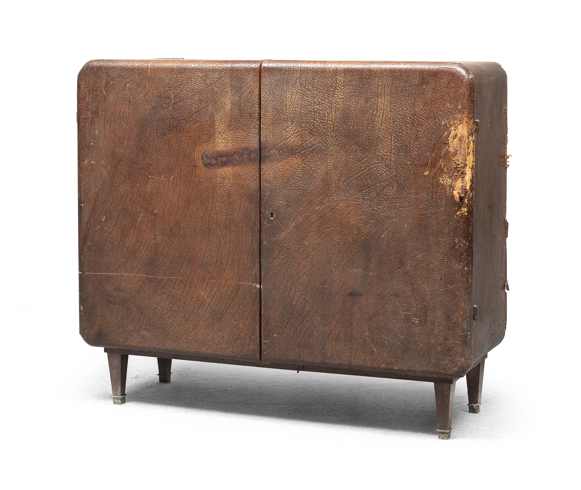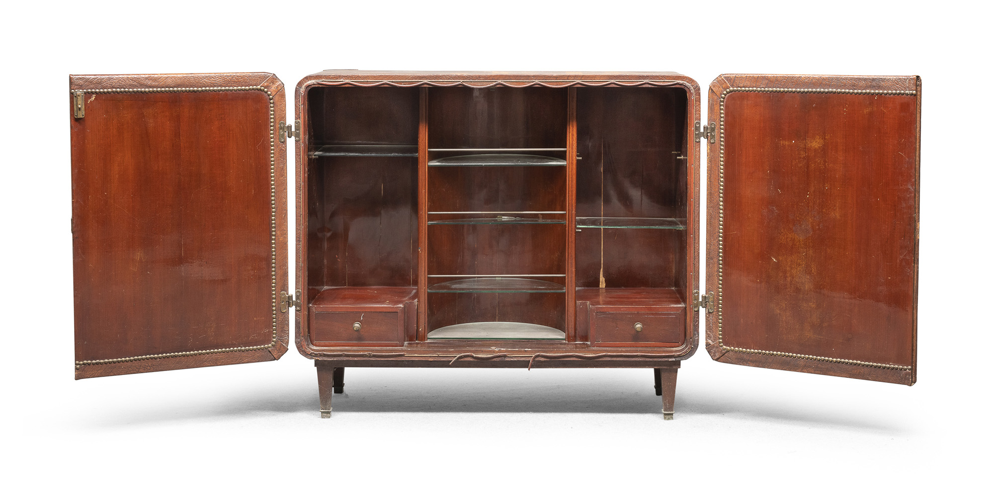 Rivestita in pelle, a due sportelli con interno in mogano rosso a bar con ripiani centrali in vetro e cassetti laterali. Piedi ad obelisco.