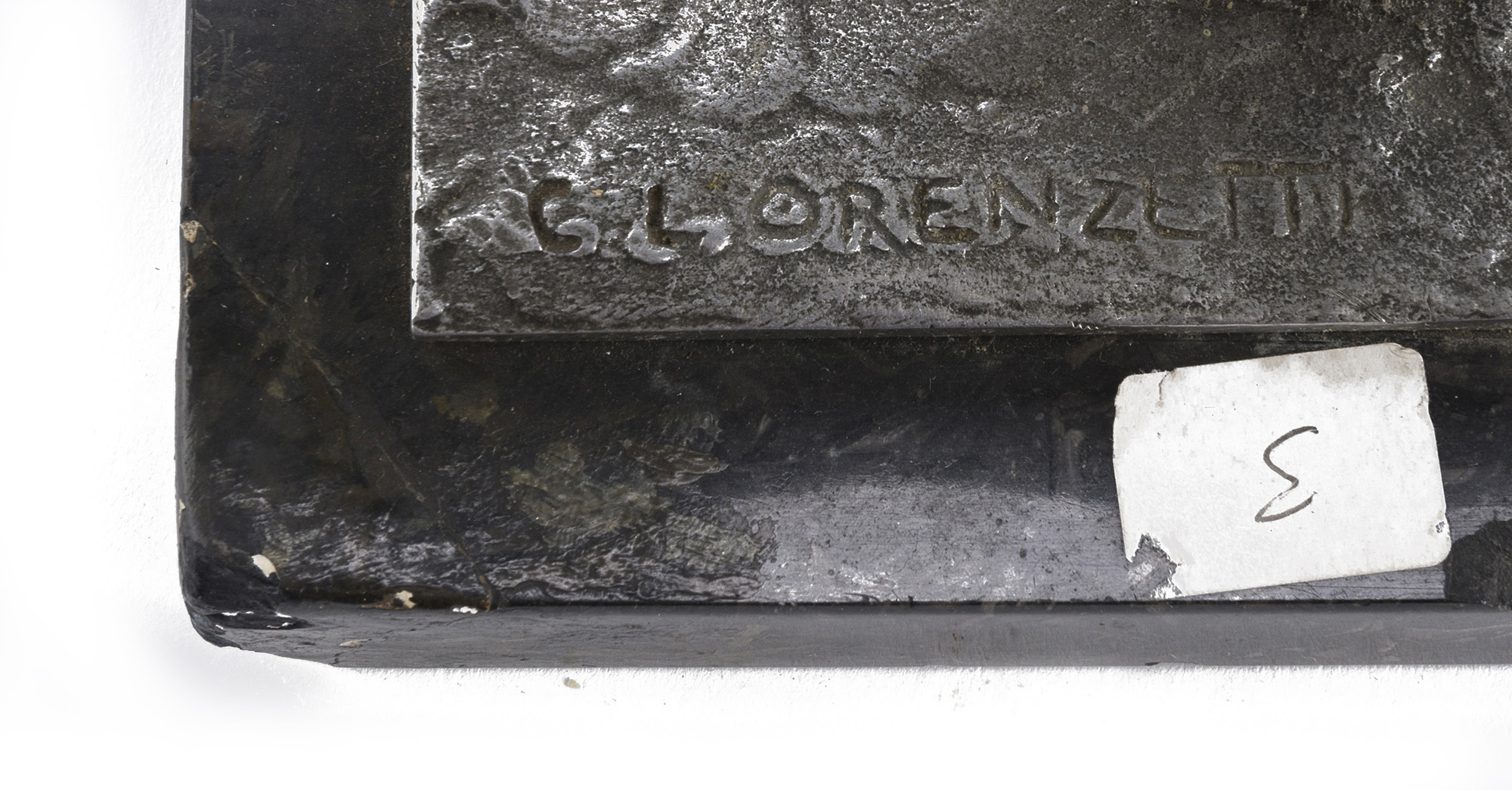 Scultura in metallo argentato, cm. 24,5 x 31 x 6