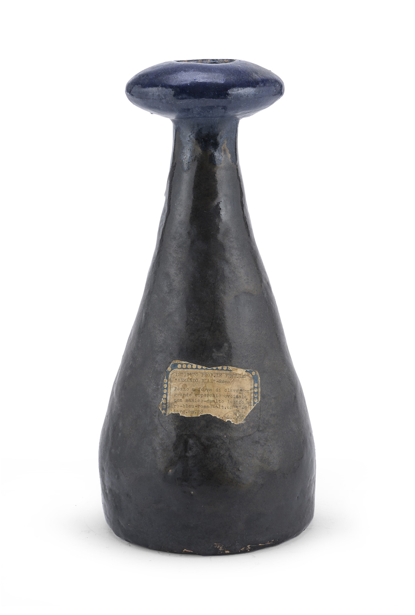 a smalto lucido nero e blu, con corpo irregolare e bocca ovale.