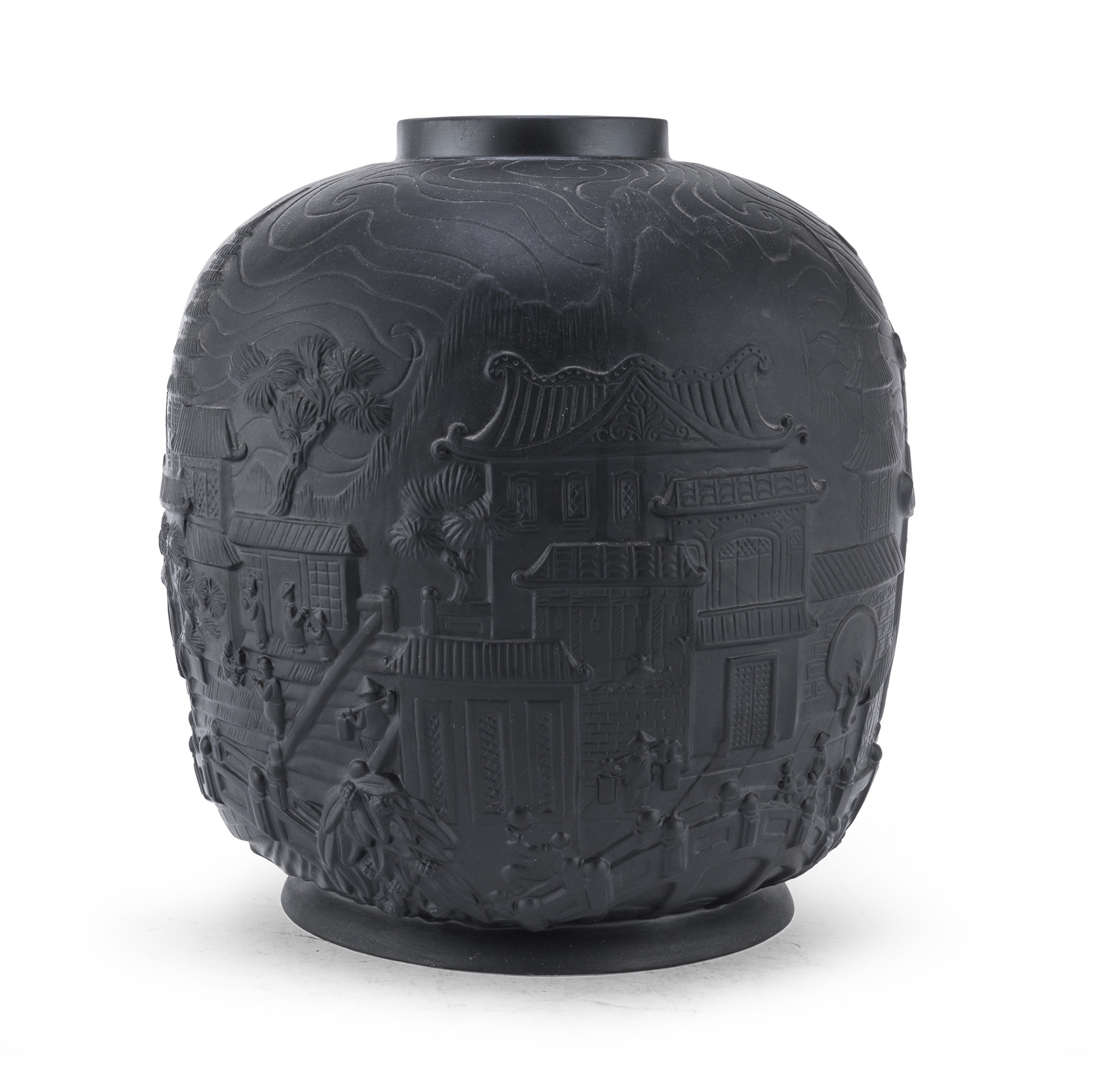 in porcellana smaltata nera, con decoro a rilievo a scene di vita tradizionale cinese.