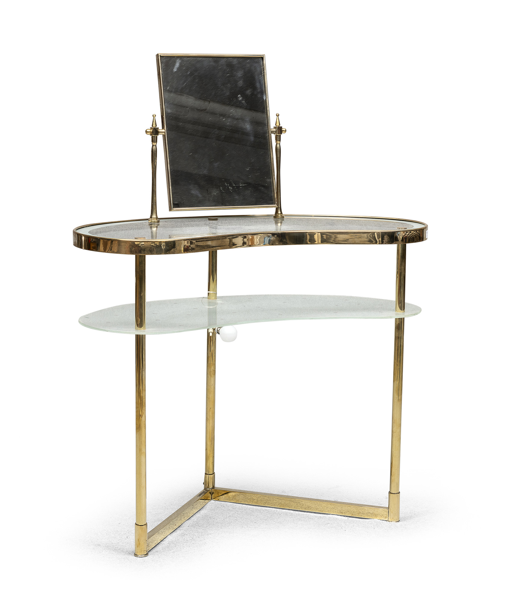 con sagoma a fagiolo a due ripiani con ripiano inferiore in vetro satinato con decoro a pois. Specchio superiore a bilico, gambe a tondino.