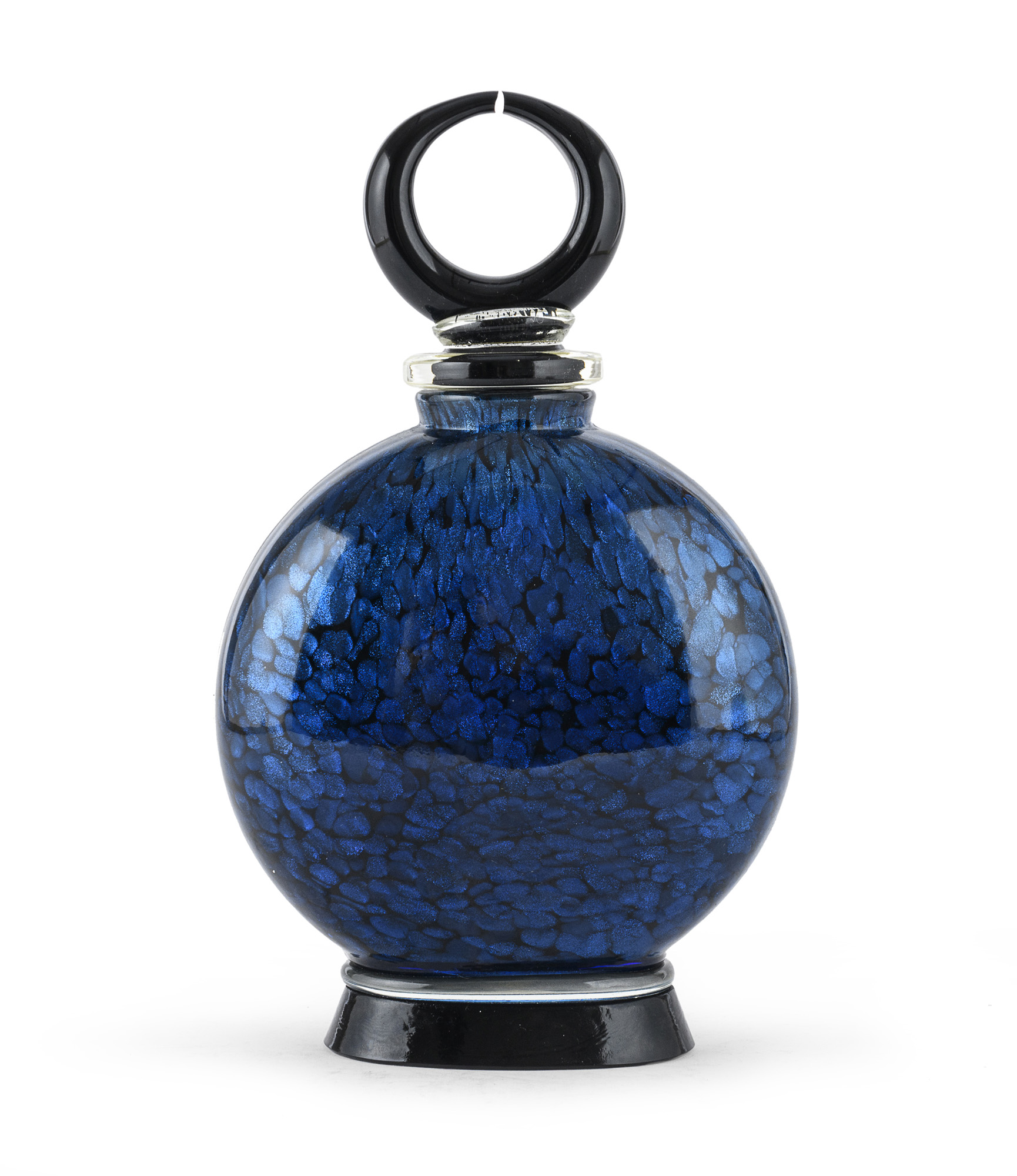 con corpo ovale schiacciato e inclusioni in avventurina. Base e tappo circolari in vetro lattimo nero.