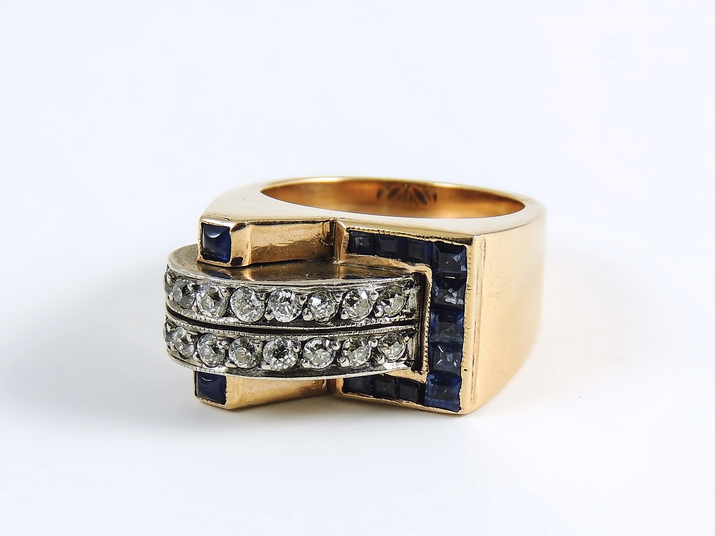 ANELLO A PONTE IN ORO ROSA, ORO BIANCO, DIAMANTI E ZAFFIRI Anni Quaranta realizzato con binari impreziositi da brillanti taglio vecchio, fascia con zaffiri di forma quadrata gr 11,2