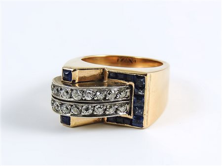 ANELLO A PONTE IN ORO ROSA, ORO BIANCO, DIAMANTI E ZAFFIRI Anni Quaranta...