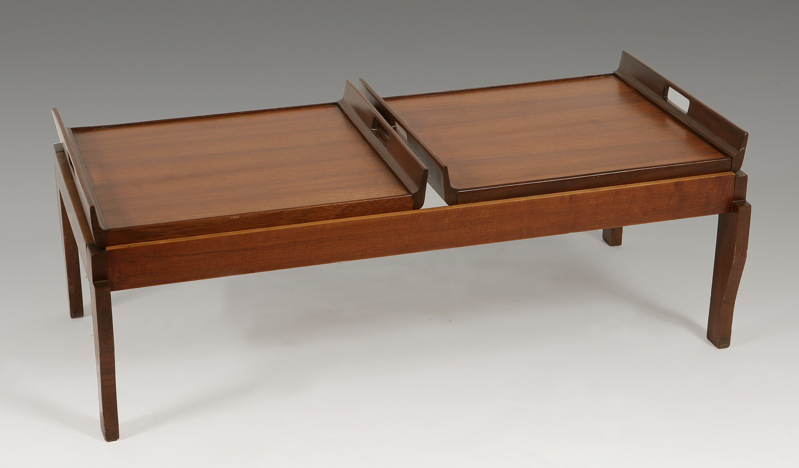 PRODUZIONE ITALIANA - ITALIAN WORK. Tavolino in legno con vassoi asportabili. Wood’s Coffee table with removables trays. Legno. Cm 37,5x101x46. Anni 50
