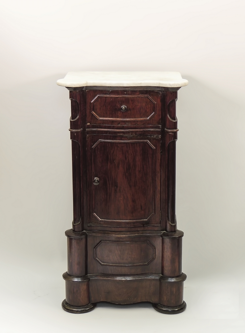 COMODINO IN MOGANO seconda metà del XIX secolo piano sagomato in marmo bianco, un cassetto ed uno sportello con cornici sagomate sul fronte mosso h cm 96,5x47x30