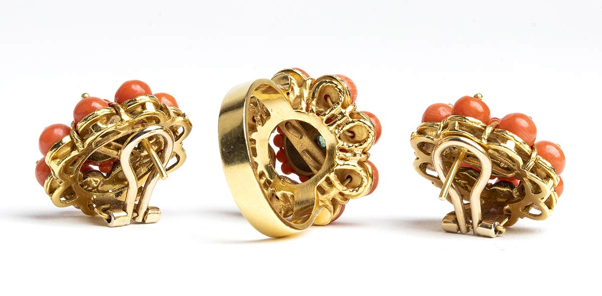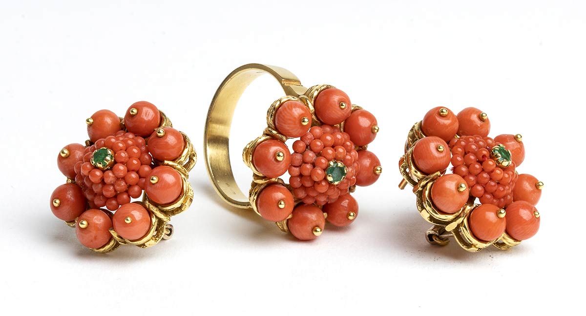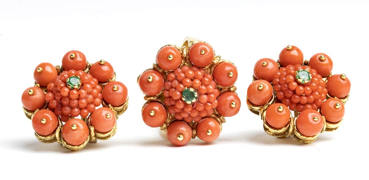 Demi parure composta da un anello ed un paio di orecchini In oro con corallo Mediterraneo e smeraldi