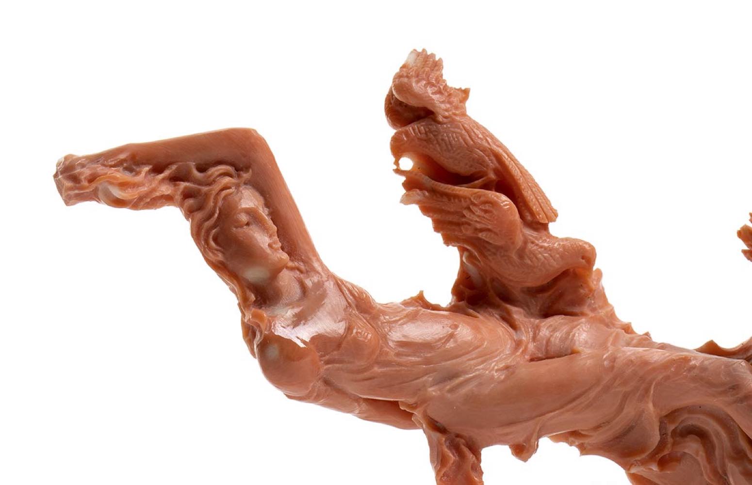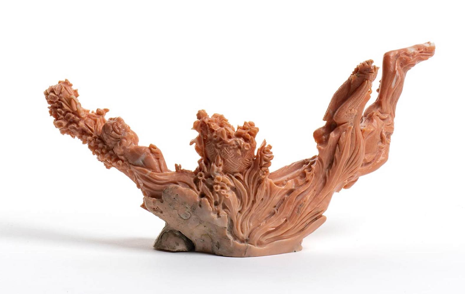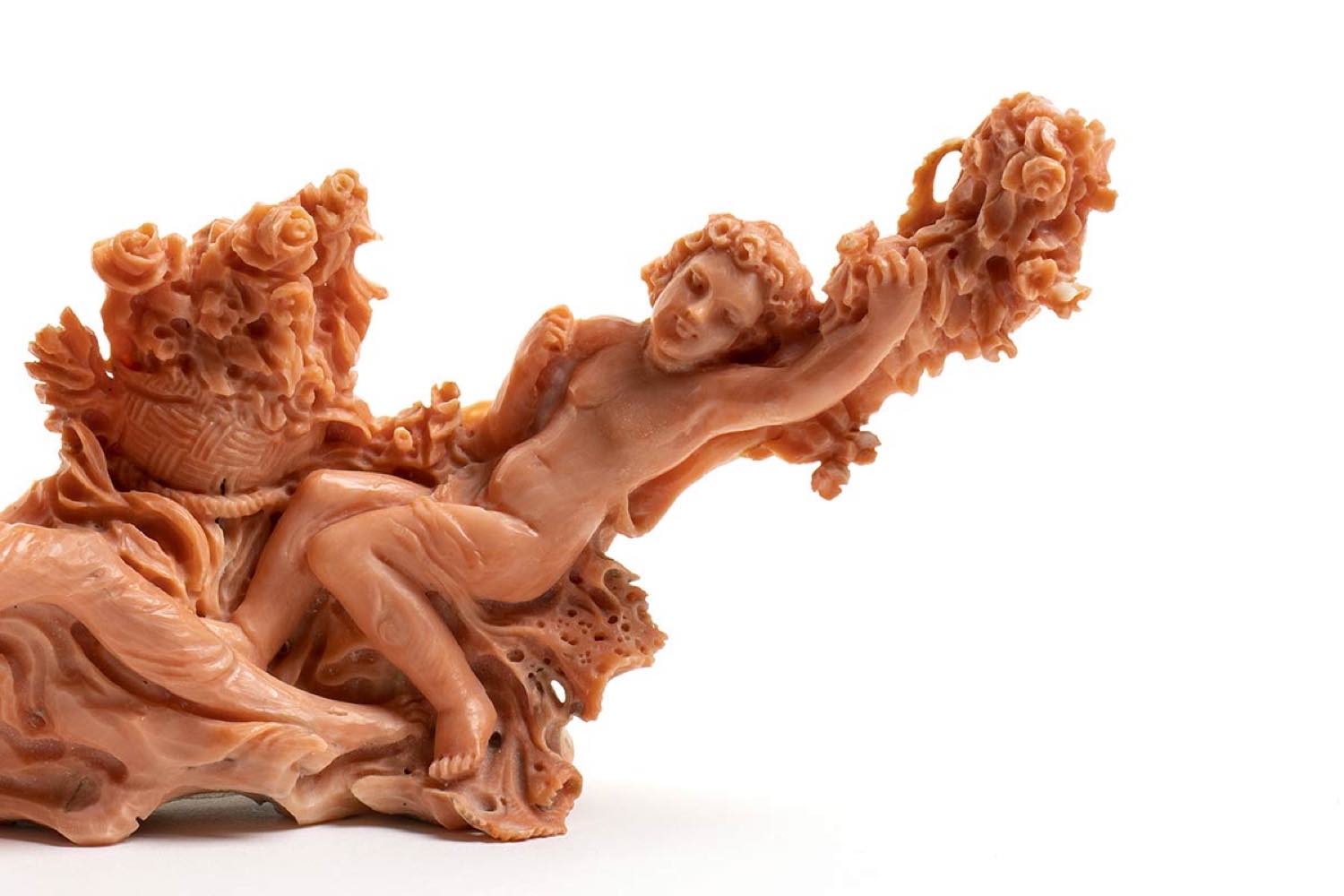 in corallo Cerasuolo (Corallium Elatius) raffigurante una figura femminile con delle colome contrapposta ad un putto; al centro un vaso di fiori.