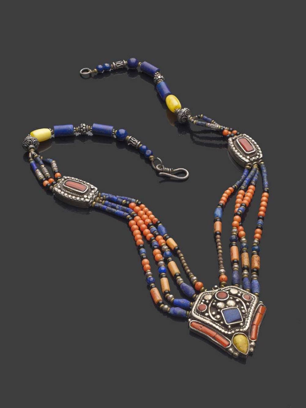 con inserti di corallo Mediterraneo (Corallium Rubrum), lapislazzuli ed altre pietre. Montaggio in lega d'argento.