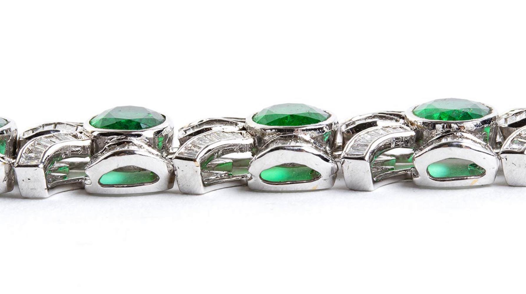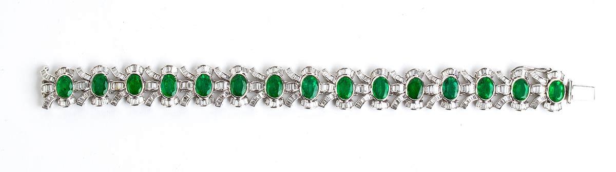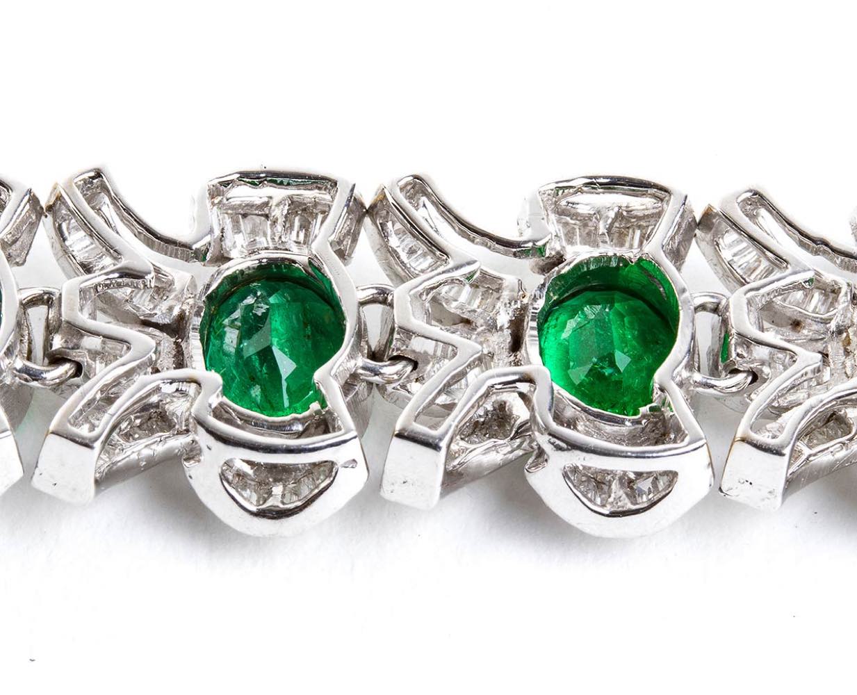 oro bianco 18k, linea di 15 smeraldi ovali 16,28 ct circa, affiancati da nastri in diamanti taglio baguette 4,28 ct circa E-F, VVS-VS. Punzonato "750".