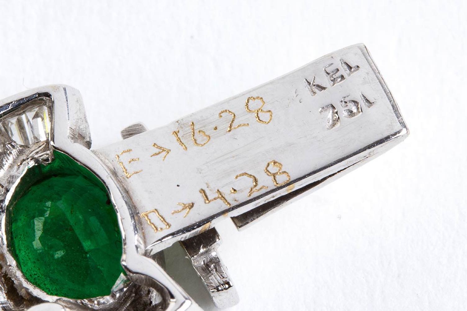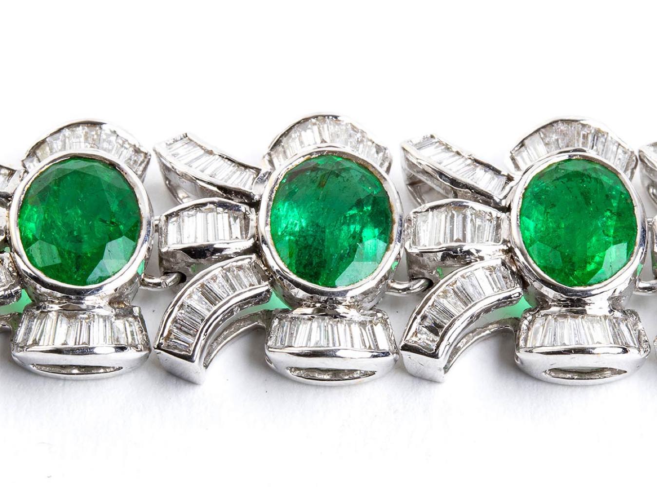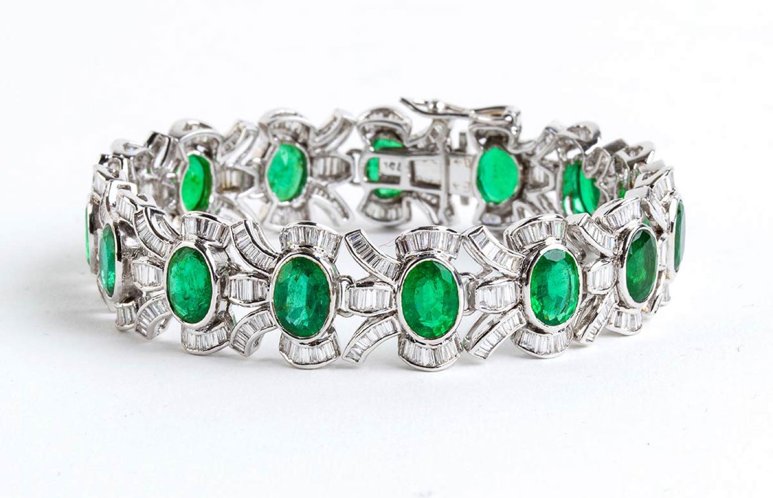 oro bianco 18k, linea di 15 smeraldi ovali 16,28 ct circa, affiancati da nastri in diamanti taglio baguette 4,28 ct circa E-F, VVS-VS. Punzonato "750".