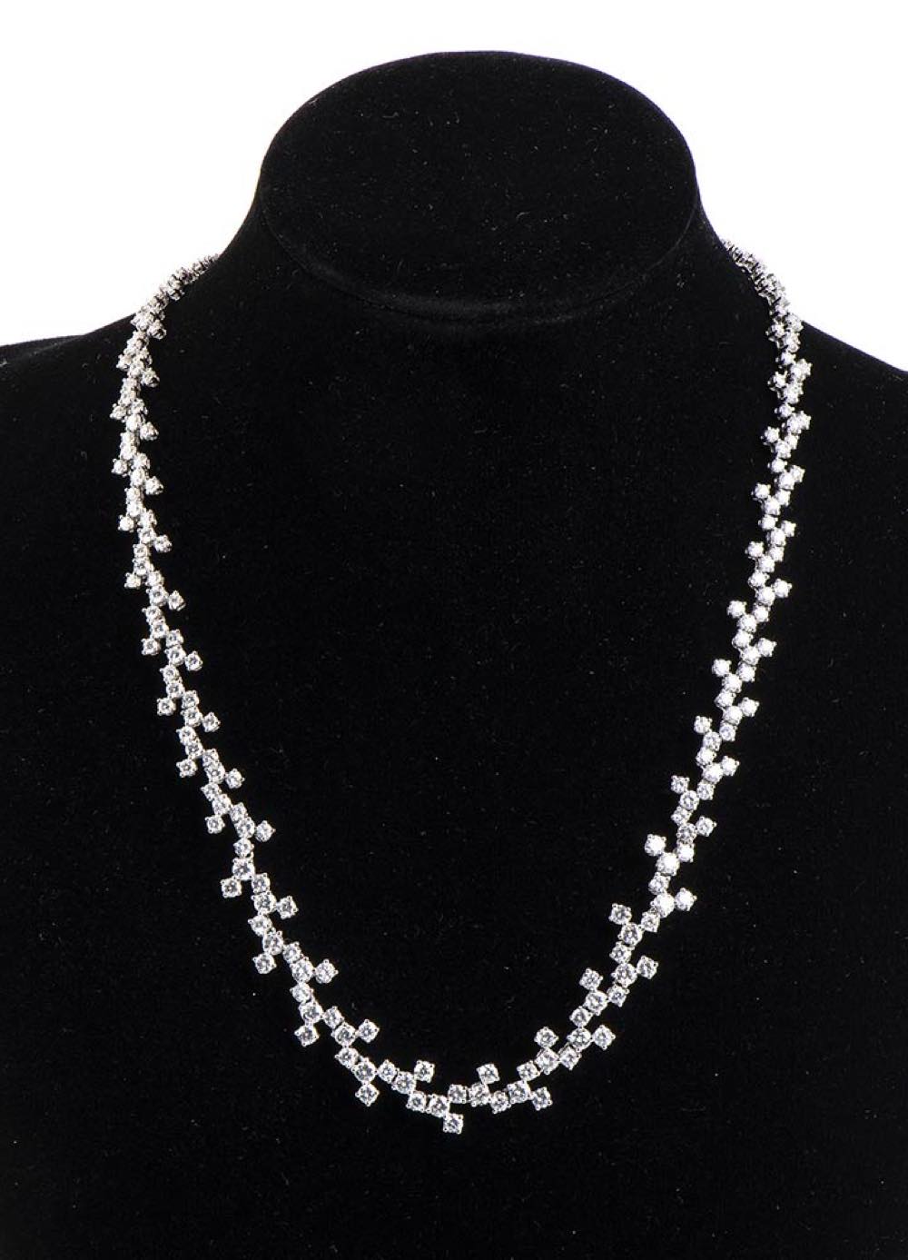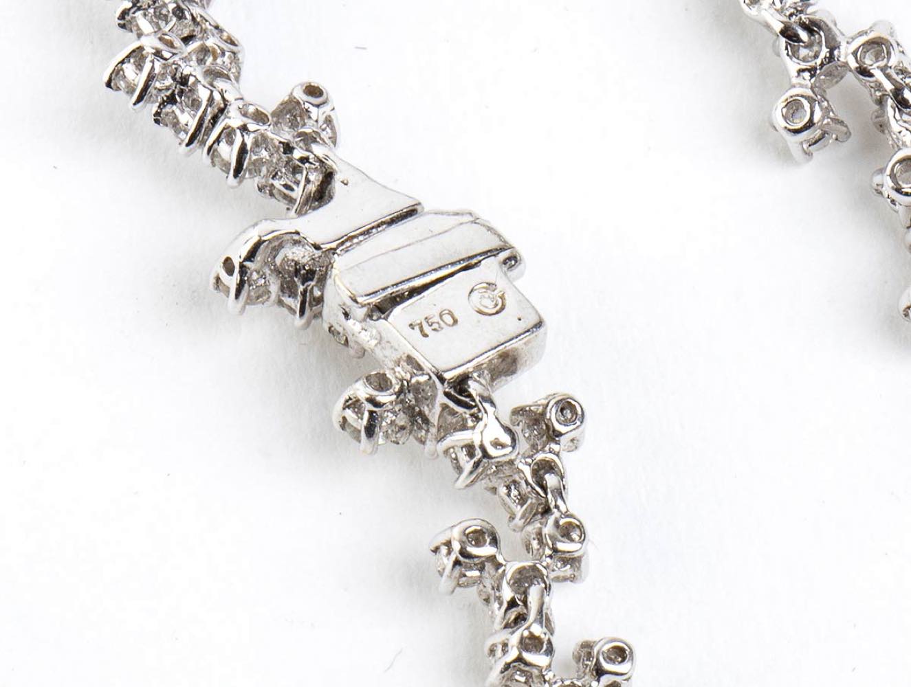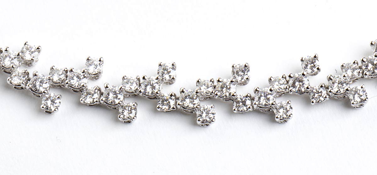 oro bianco 18k, punteggiato da diamanti taglio brillante 12,00 ct circa, E-F, VVS. Punzonato "750".