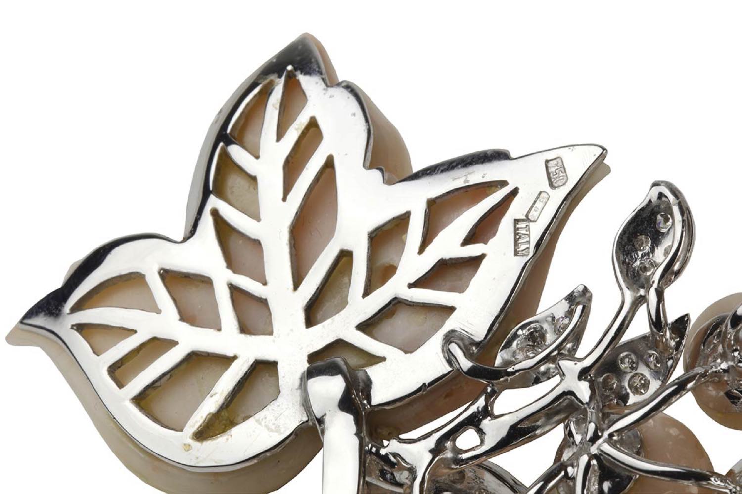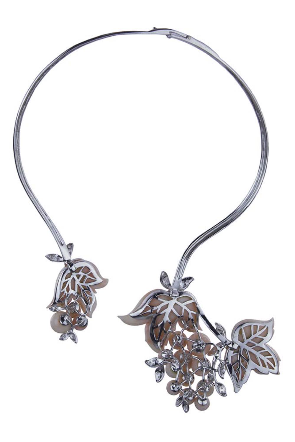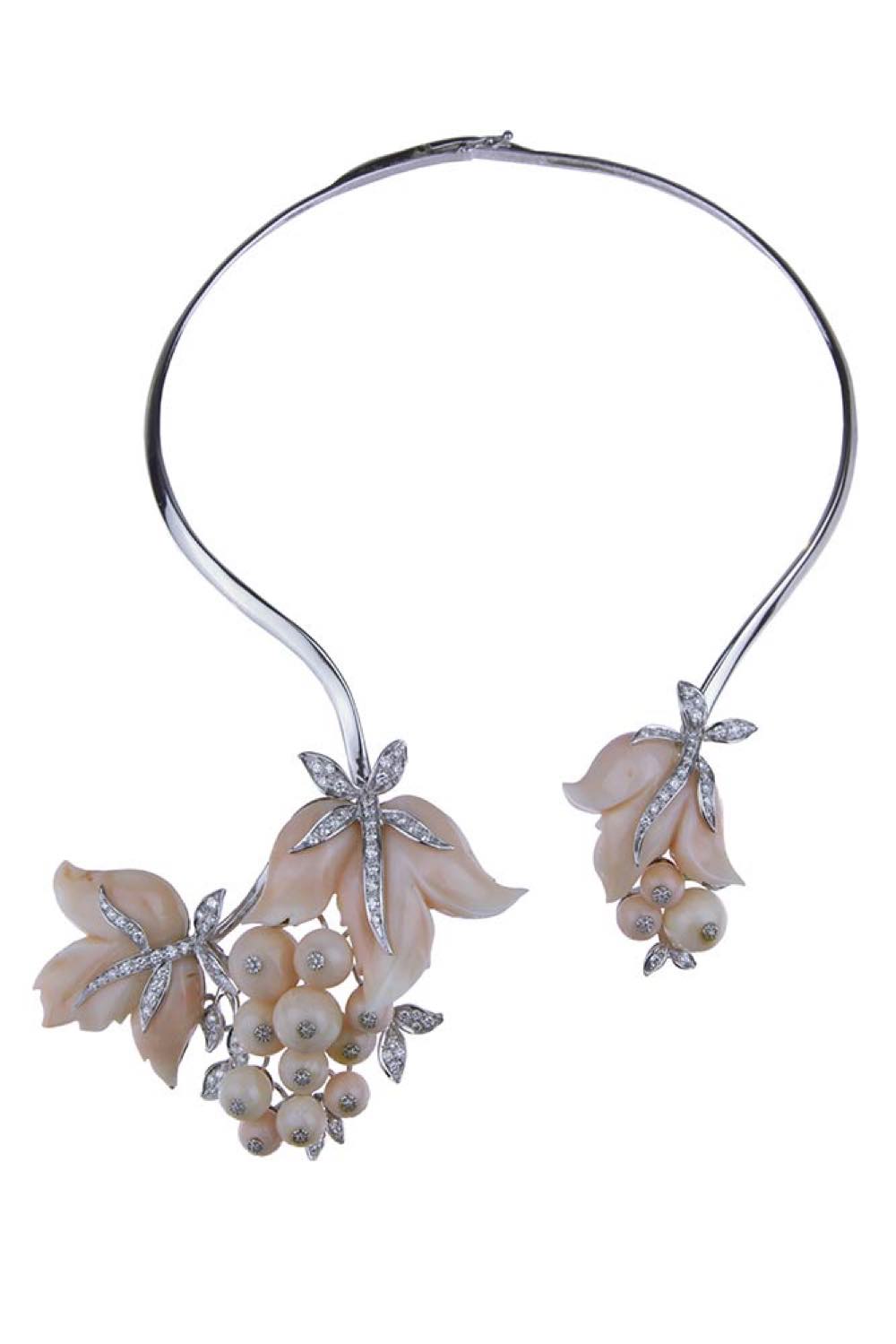 sottile nastro ricurvo in oro bianco 18k, terminato con motivo di fiore, foglie e frutti in corallo rosa (corallium secundum), dettagli in diamanti rotondi taglio brillante 1,60 ct circa, E-F, VS-SI. Punzonato "759 - 47 CE - ITALY".