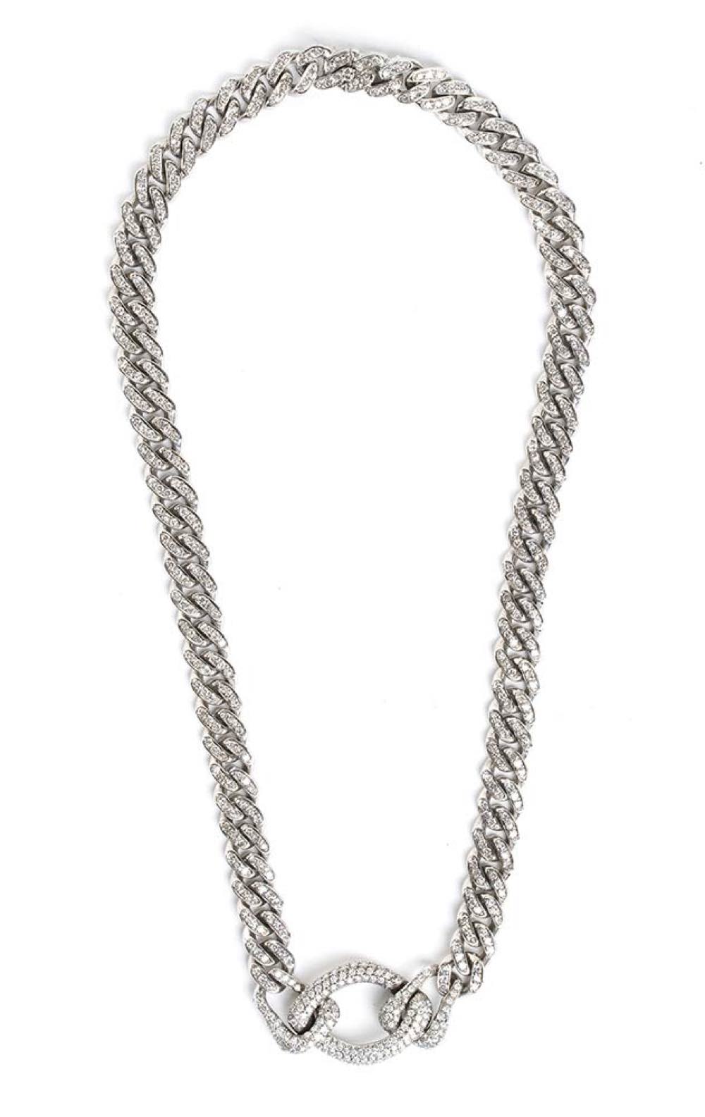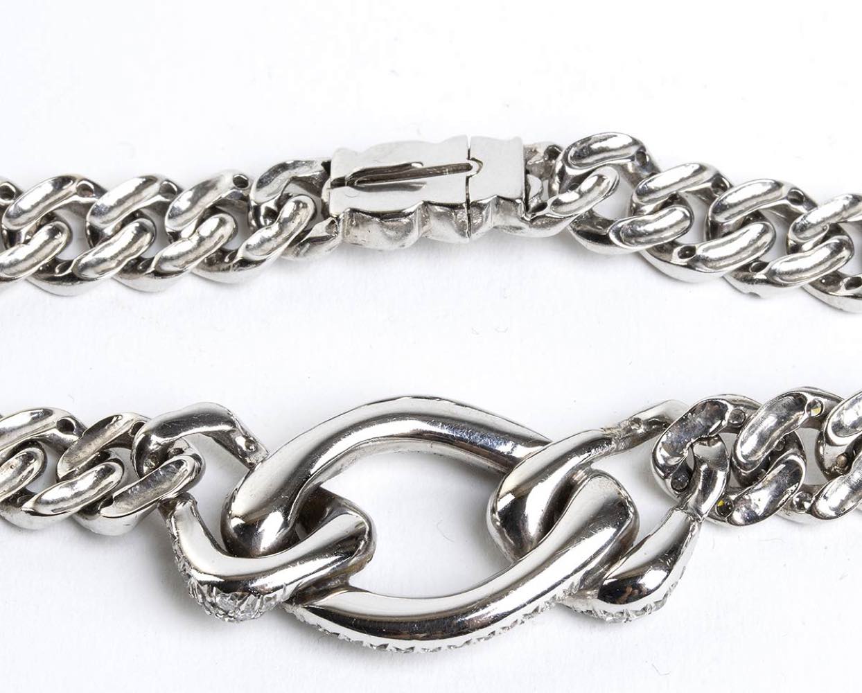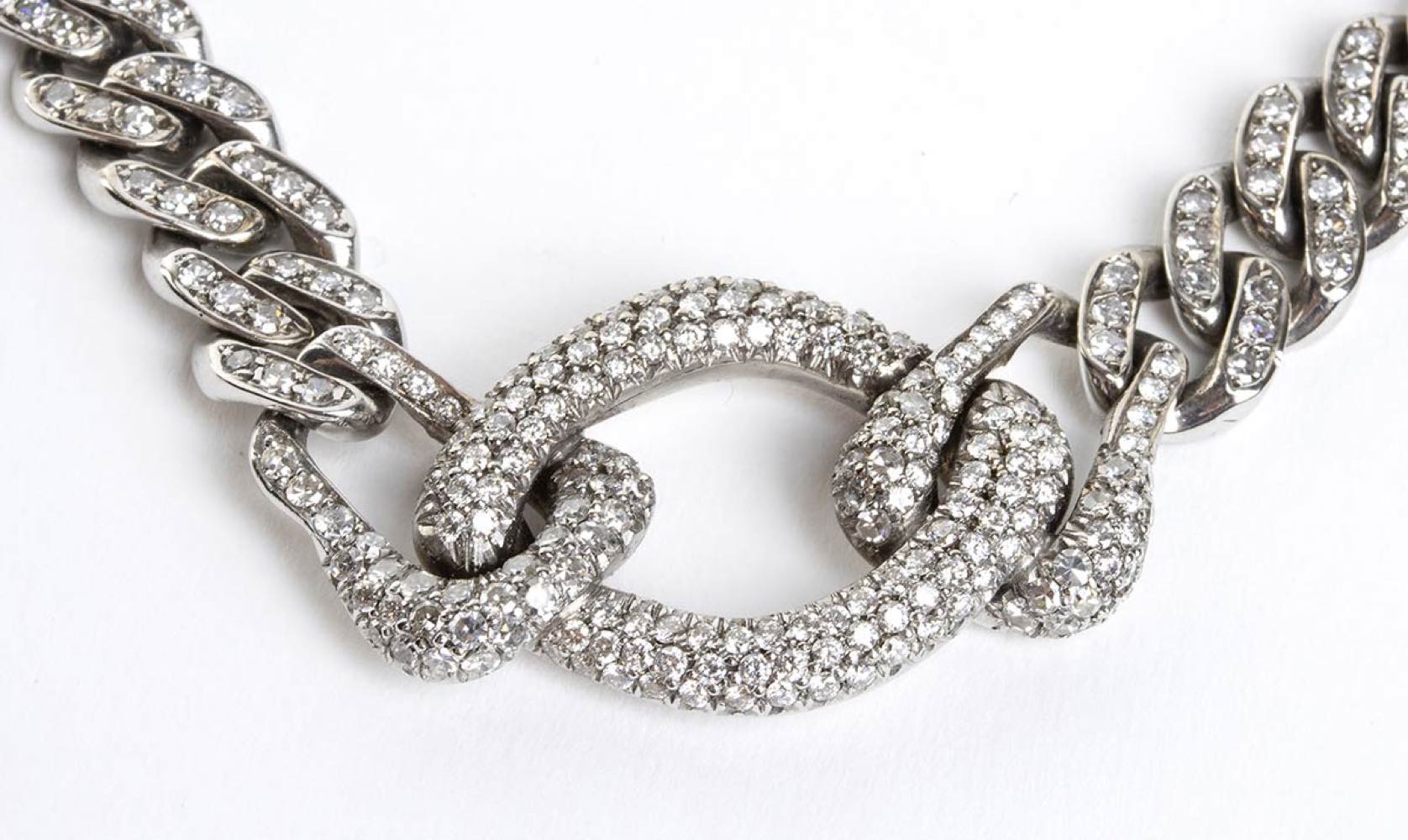 oro bianco 18k, catena a maglia grumetta e motivo centrale di nastri in pave' di diamanti rotondi taglio brillante e huit-huit 8,00 ct circa, E-F, VVS-VS.