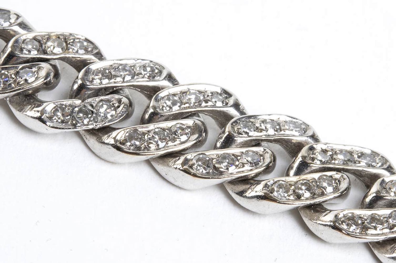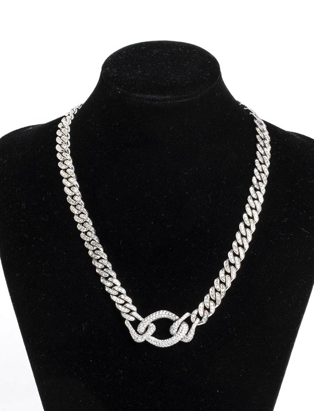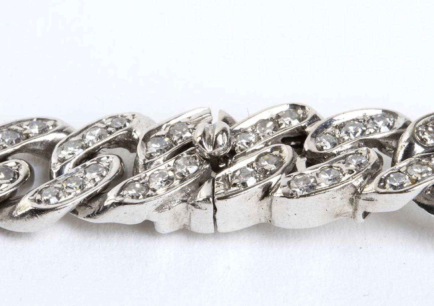 oro bianco 18k, catena a maglia grumetta e motivo centrale di nastri in pave' di diamanti rotondi taglio brillante e huit-huit 8,00 ct circa, E-F, VVS-VS.