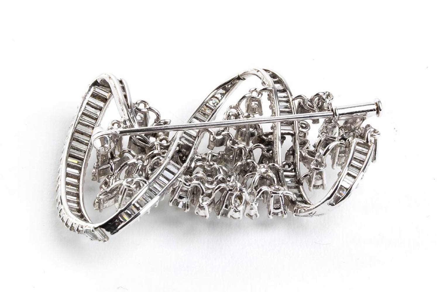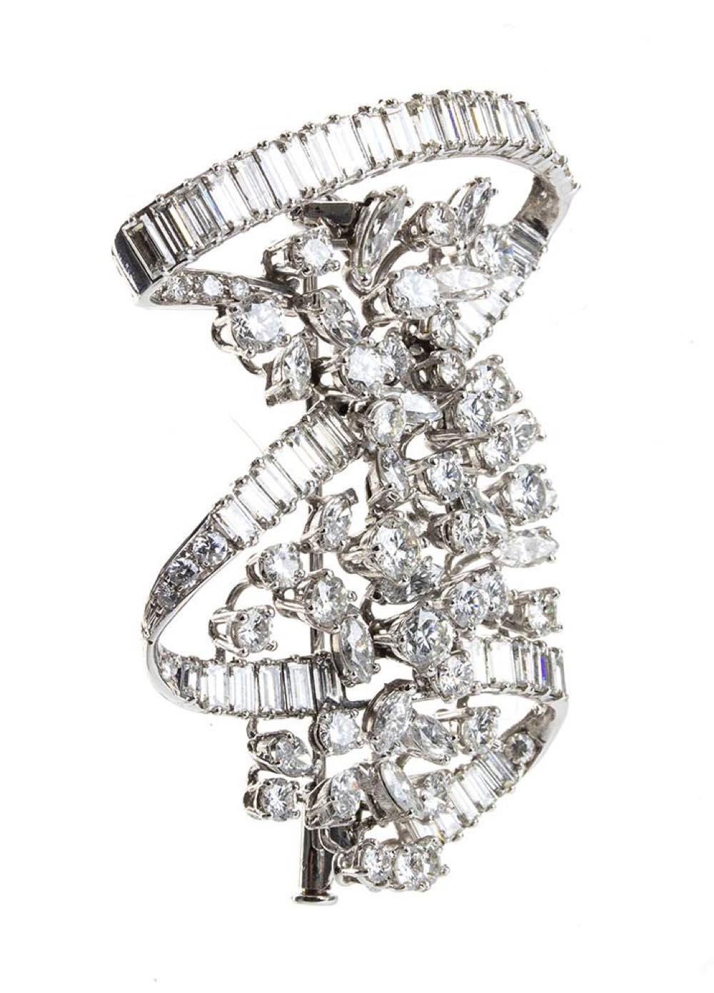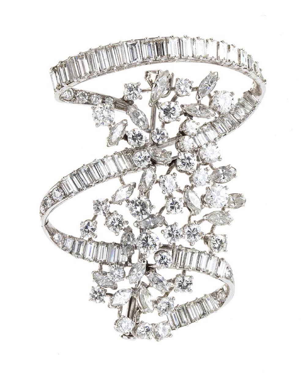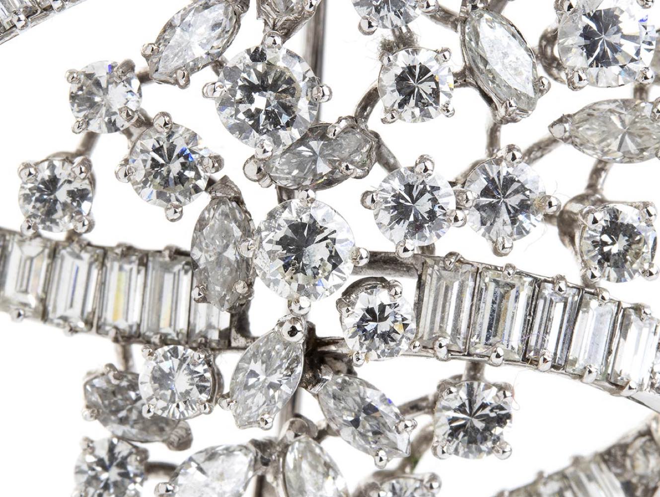 oro bianco 18k, con motivo di nastro mosso in diamanti taglio baguette e punteggiature in diamanti a navetta e taglio brillante 8,20 ct circa, E-F, IF-SI.
