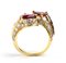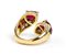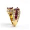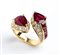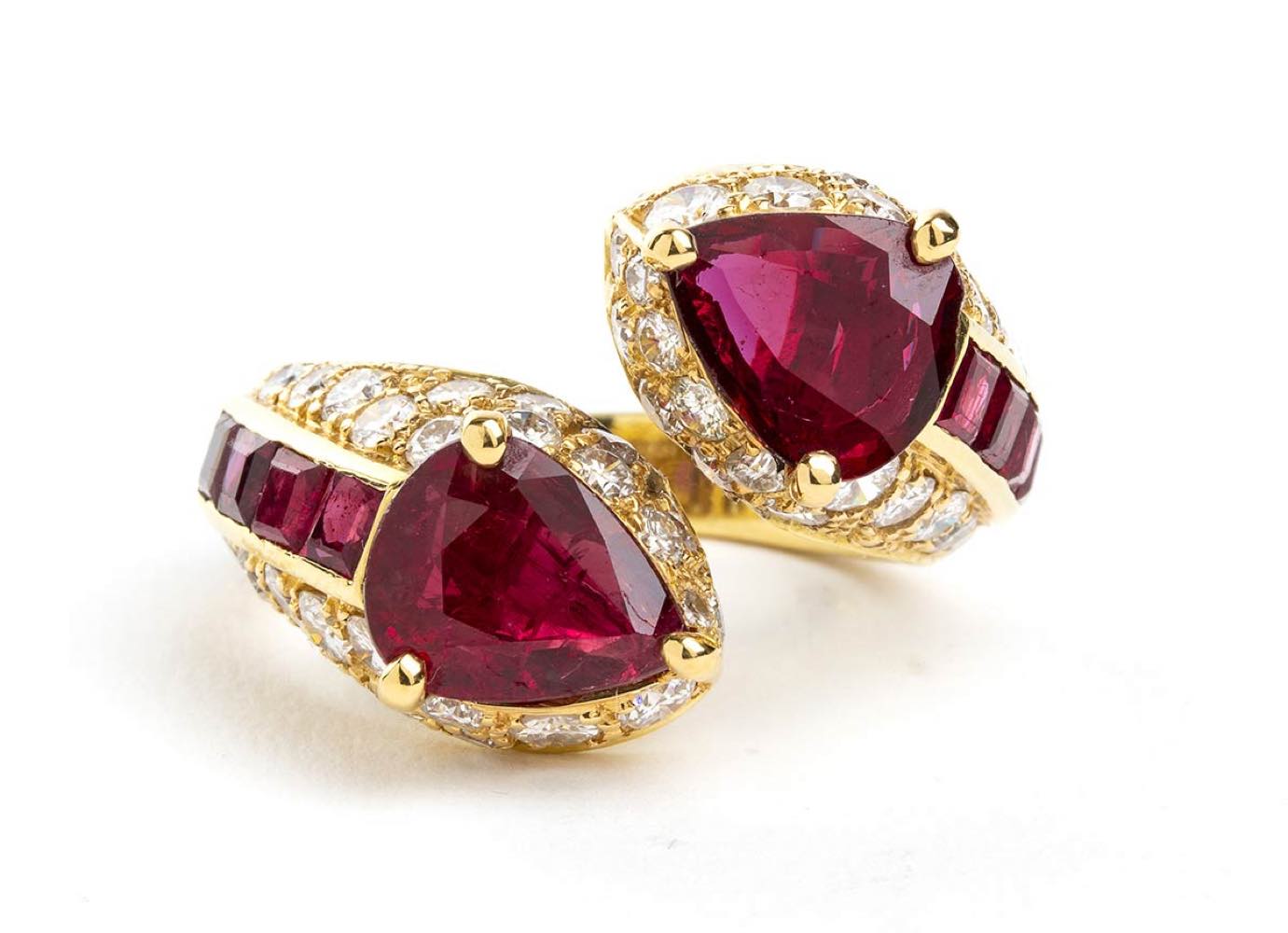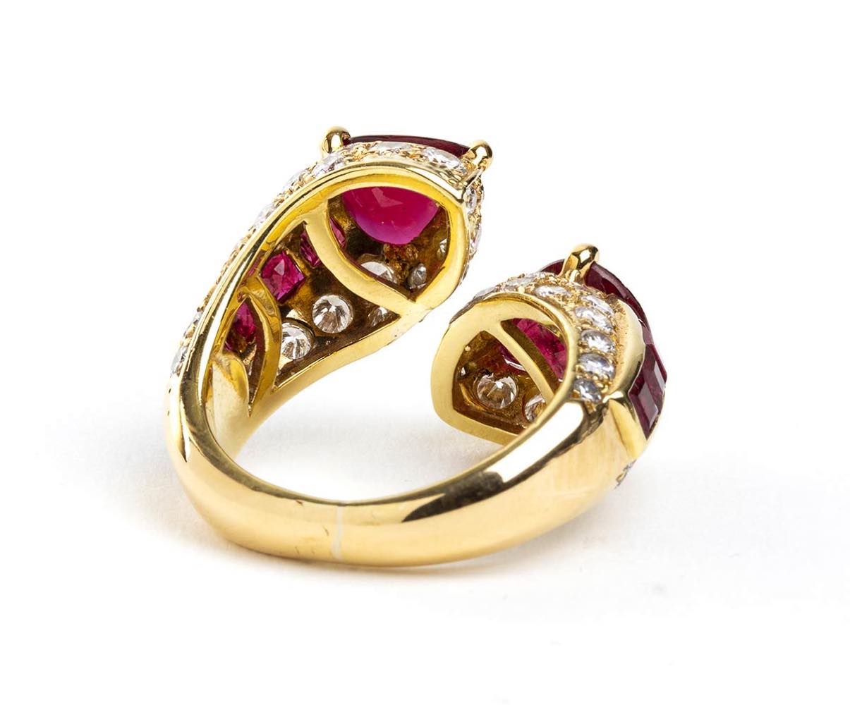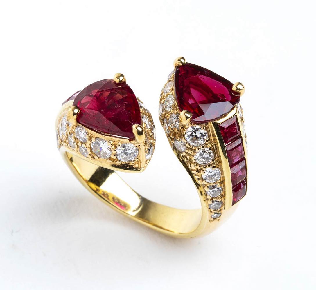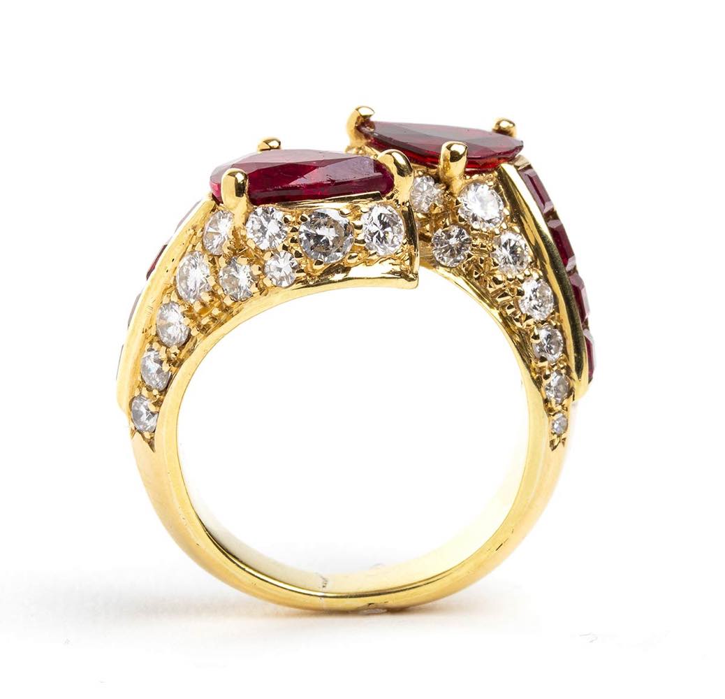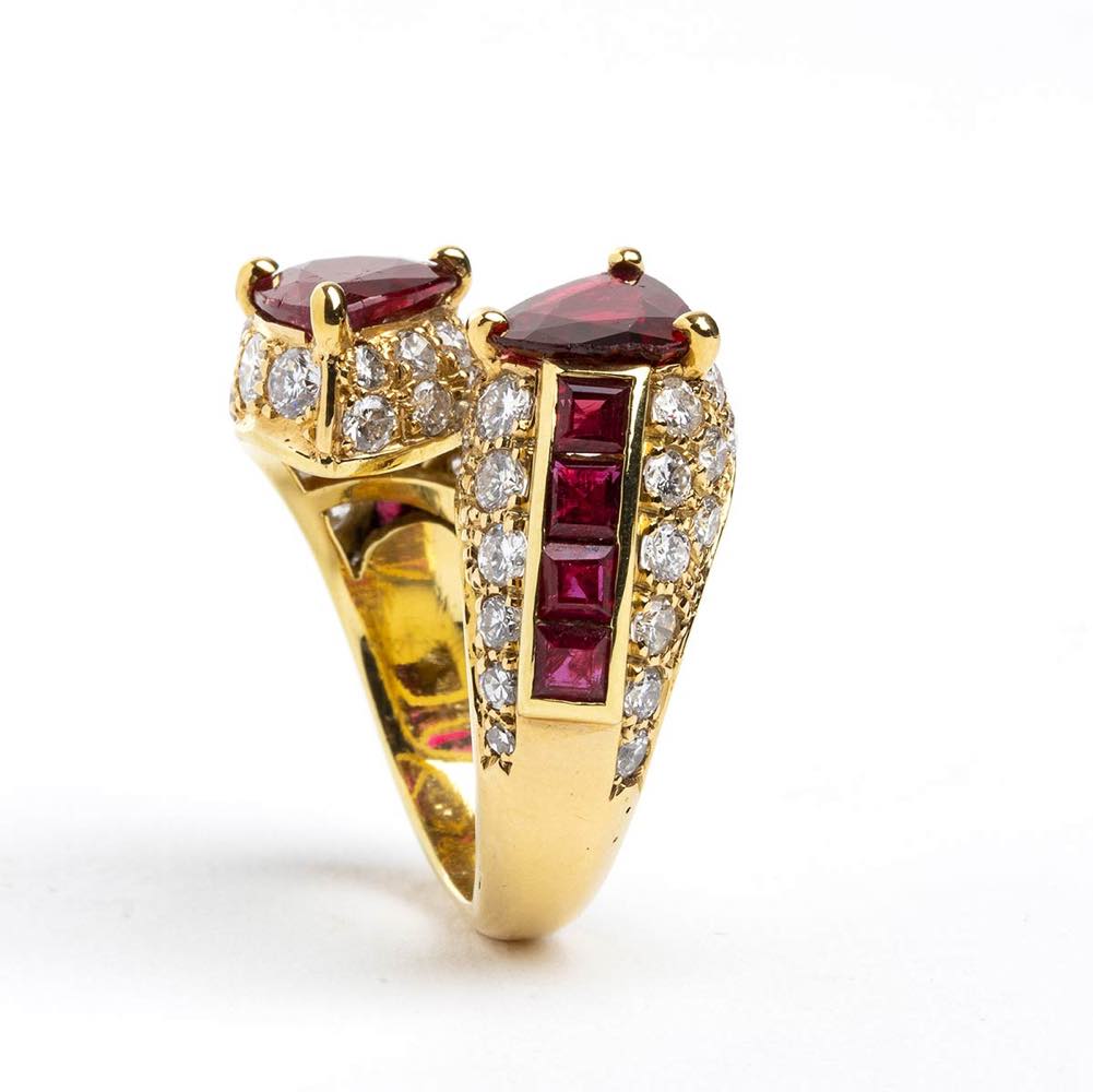 Anello a fascia, motivo contrarie' con coppia di gocce di rubino, rubini carre' e diamanti