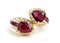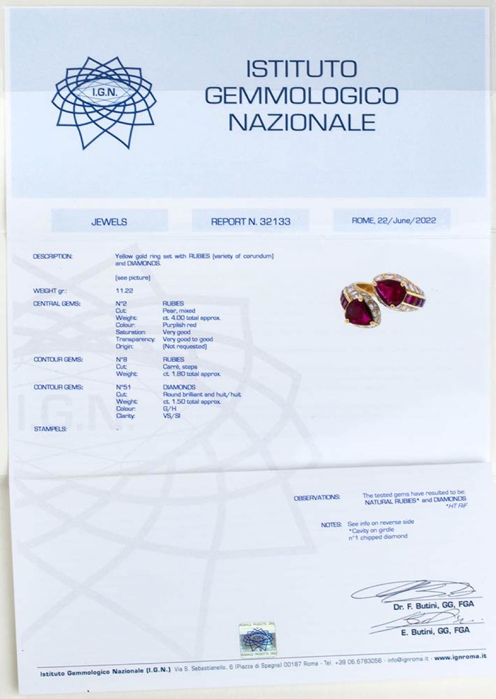oro giallo 18k, incastonato con coppia di gocce di rubino per totali 4,00 ct circa, affiancati da linea di rubini quadrati 1,80 ct circa, contornati da pave' di 51 diamanti rotondi taglio brillante e taglio huit-huit 1,50 ct circa, G-H, VS-SI.
