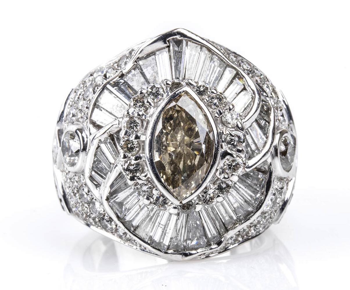 oro bianco 18k, incastonato con diamante a navetta 1,80 ct circa, colore fancy giallo bruno, purezza I1, contornato da altri diamanti taglio brillante e taglio tapered 7,20 ct circa, F-G, SI.