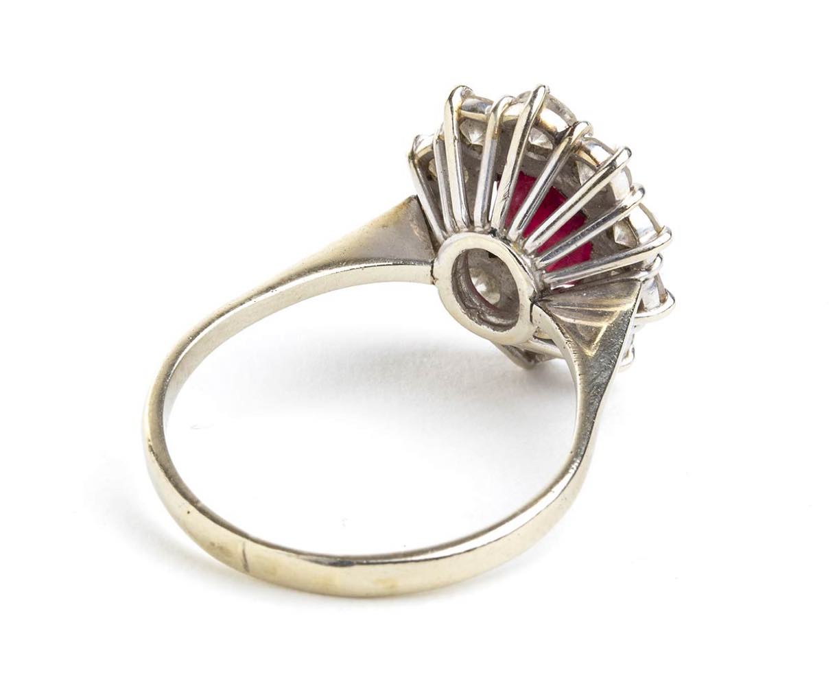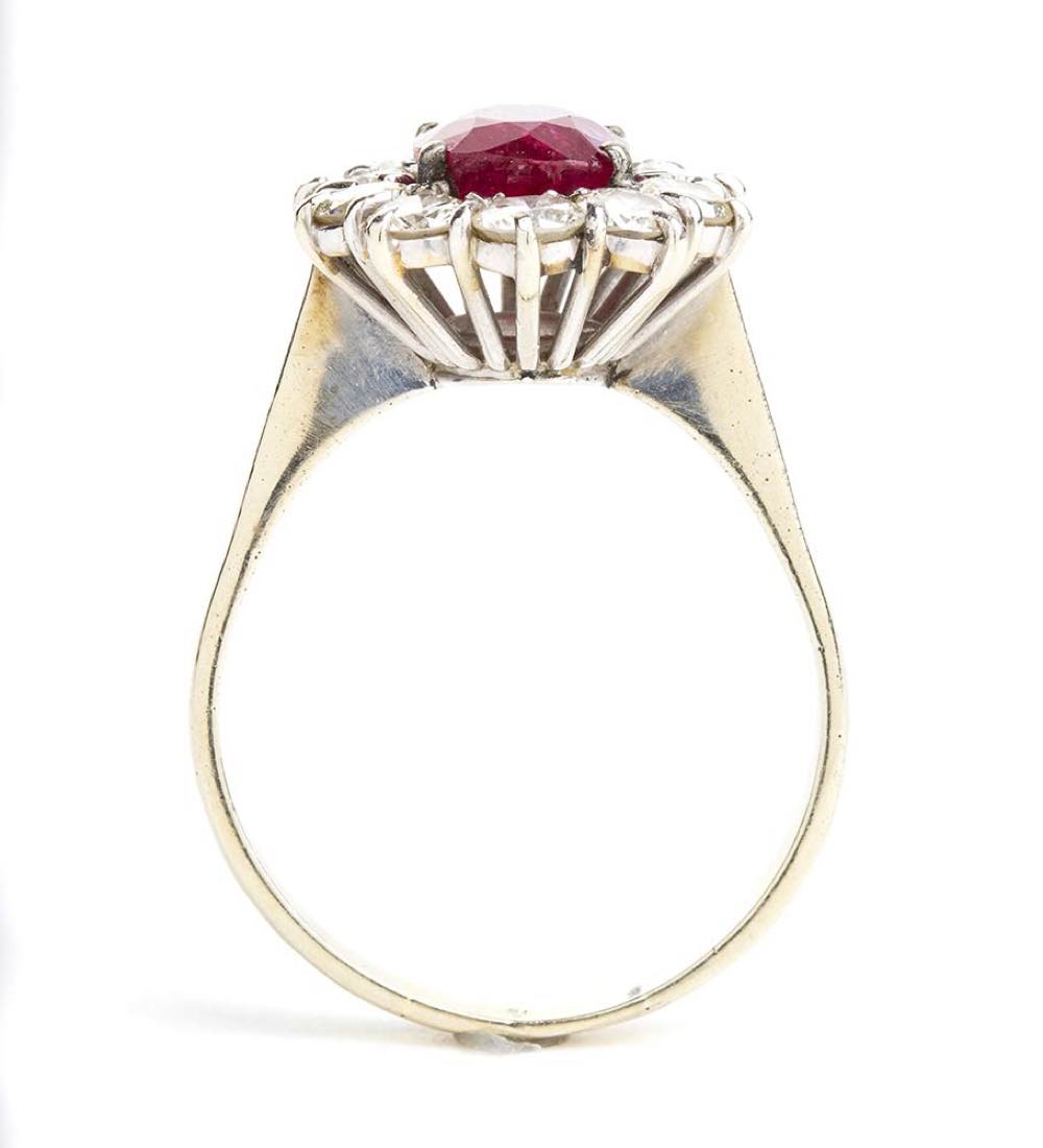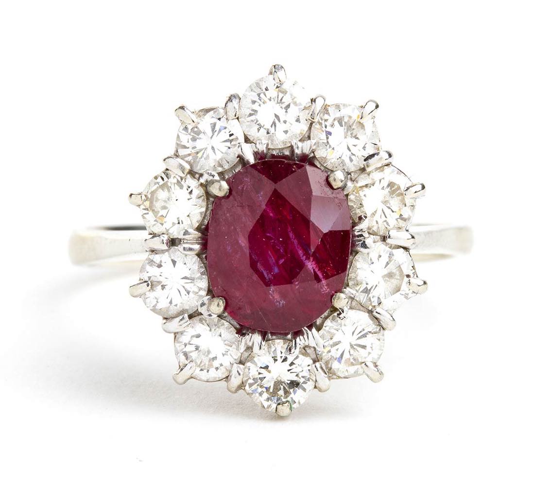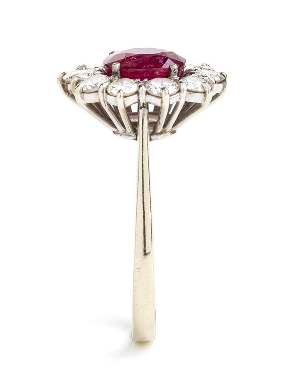 oro bianco 18k, incastonato con rubino ovale 2,15 ct circa, (assenza di trattamento termico), contornato da 10 diamanti rotondi taglio brillante 1,50 ct circa, G-H, VVS-VS.
