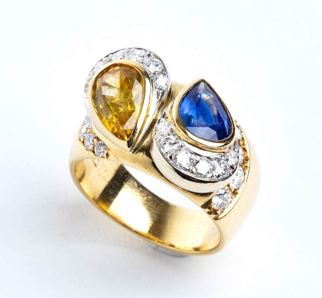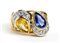 oro giallo e bianco 18k, incastonato con goccia di zaffiro 1,80 ct circa, goccia di corindone giallo 1,80 ct contornati da pave' di diamanti rotondi taglio brillante 1,20 ct circa, E-F, VVS. Punzonato "750 - 94 MI".