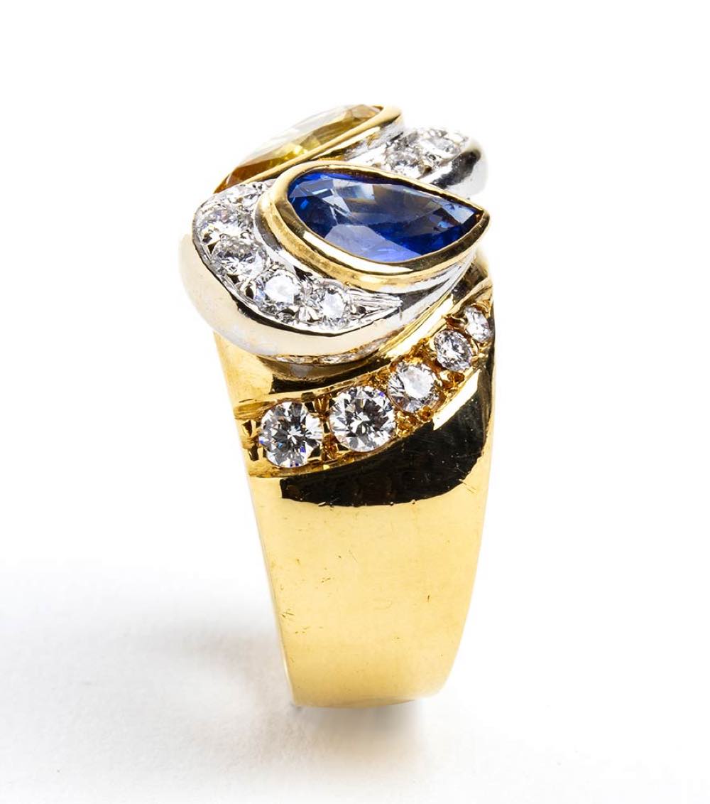 Anello a fascia, motivo contrarie' con gocce di zaffiro, corindone giallo e diamanti