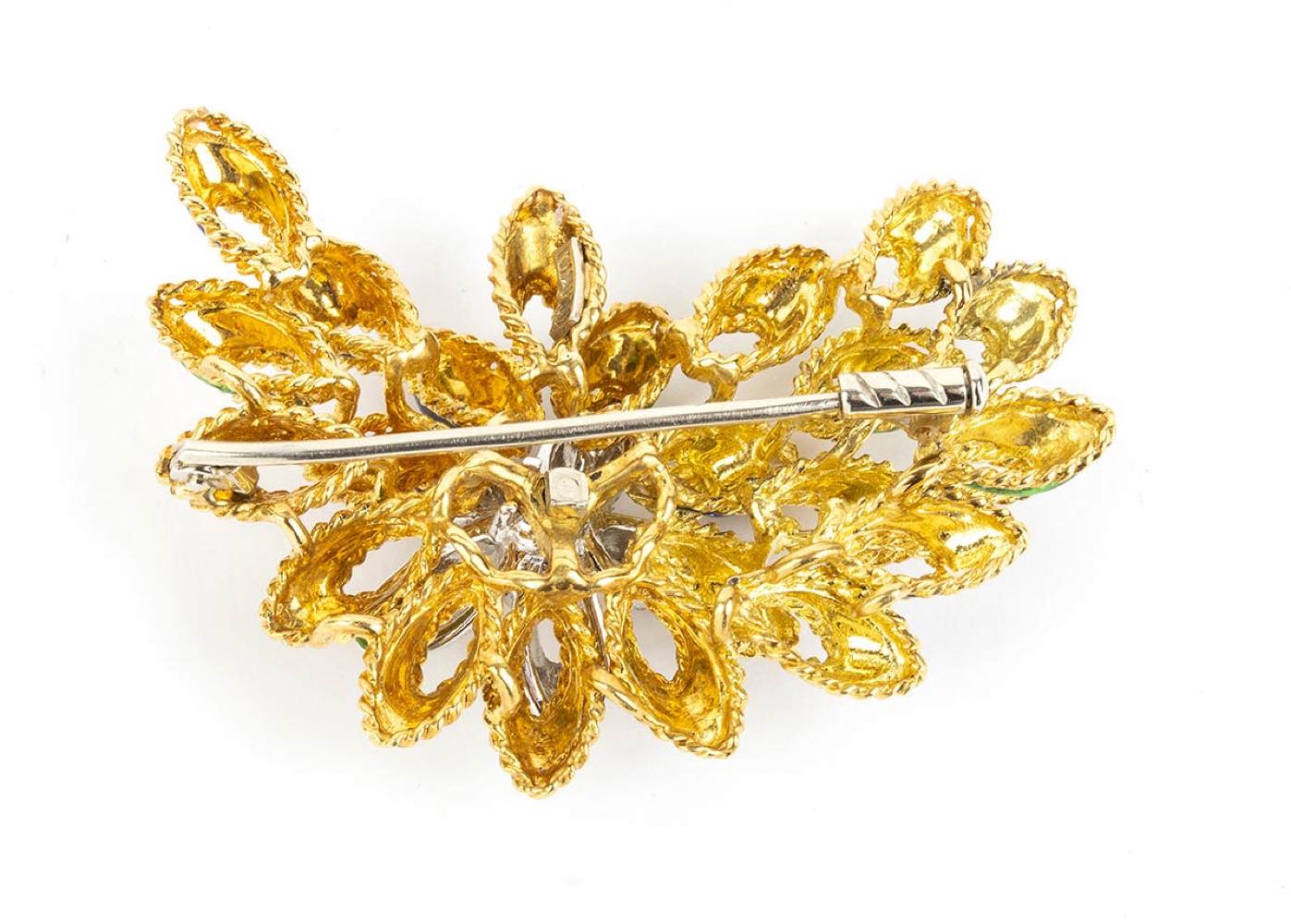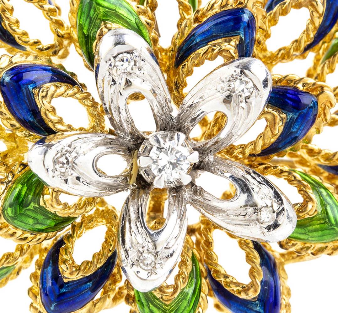 Spilla a motivo floreale in oro smalti e diamanti