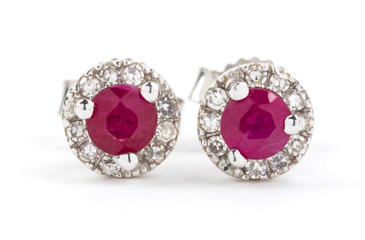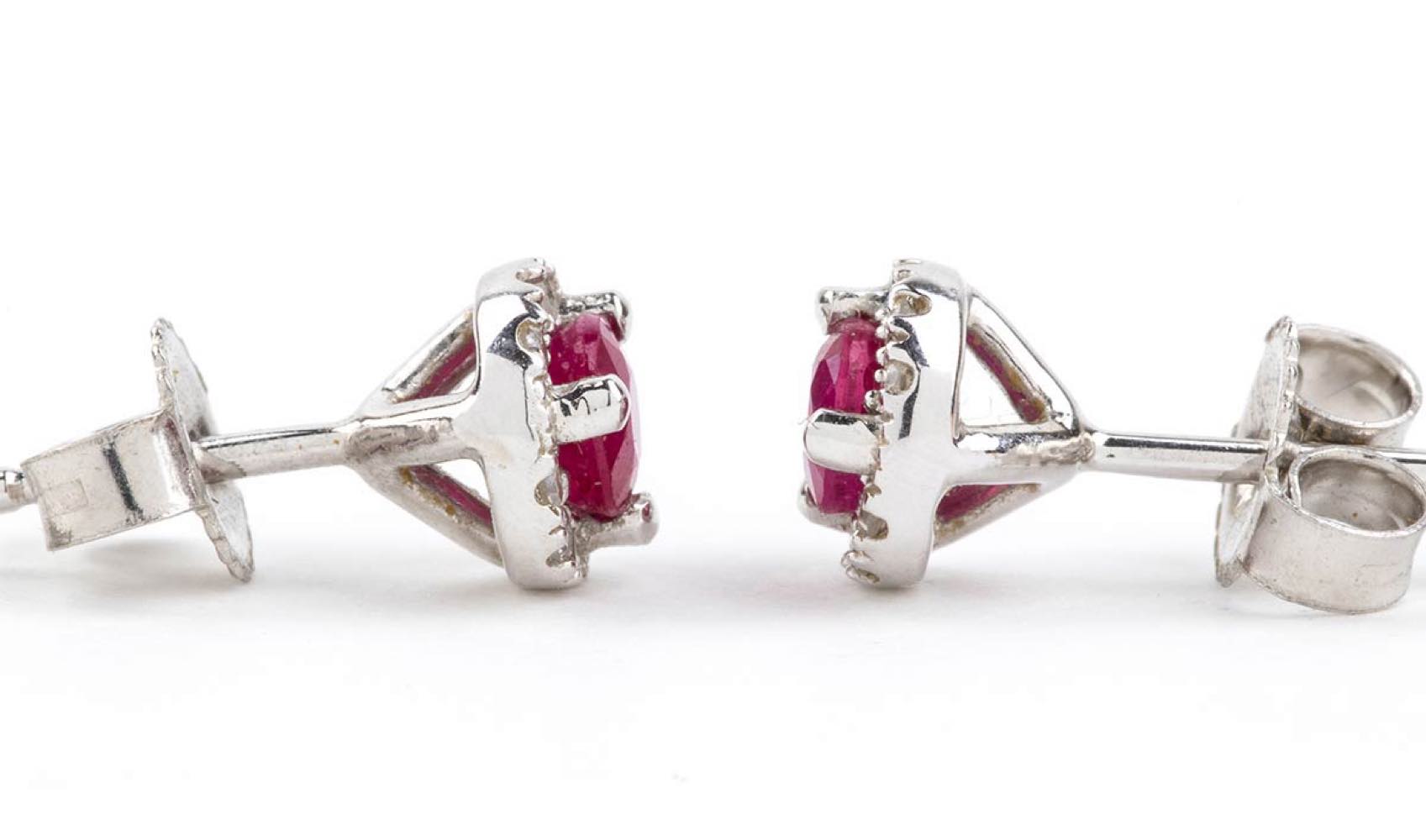 Paio di orecchini incastonati con rubini 1,60 ct circa totali, cotornati da diamanti taglio huit-huit circa 0,20 ct, G-H, VS-SI.