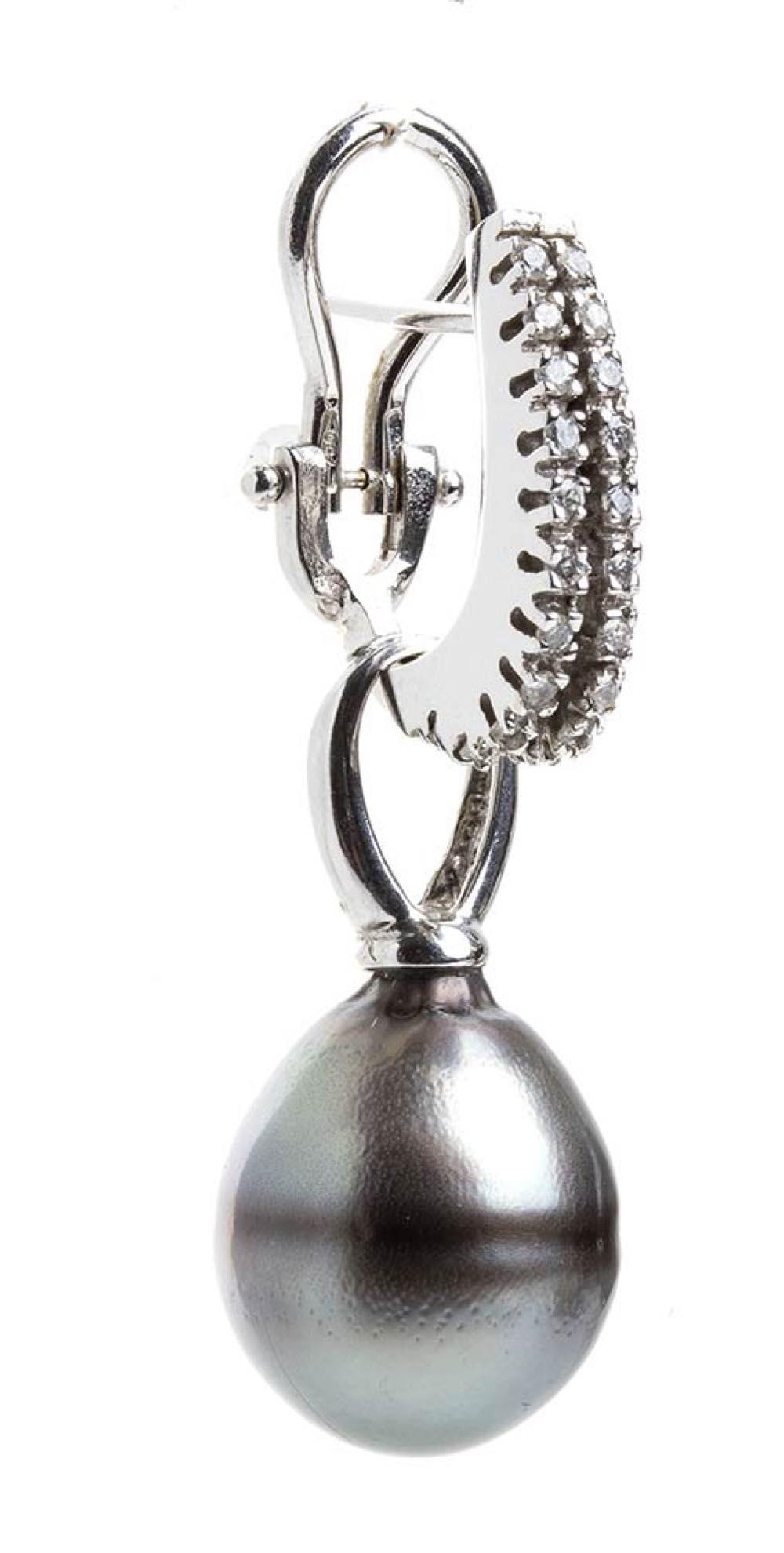 oro bianco 18k, incastonati con linea di diamanti rotondi taglio brillante 0,45 ct circa, G-H, VVS-VS, a cui e' sospeso un pendente amovibile con perla Tahiti. Punzonati "750".