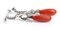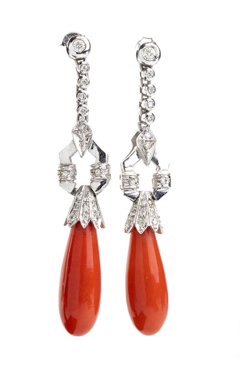 oro bianco 18k, con gocce di corallo Mediterraneo (corallium rubrum) sormontate da linea di diamanti taglio brillante 0,45 ct circa, H, VS-SI. Punzonati "750".