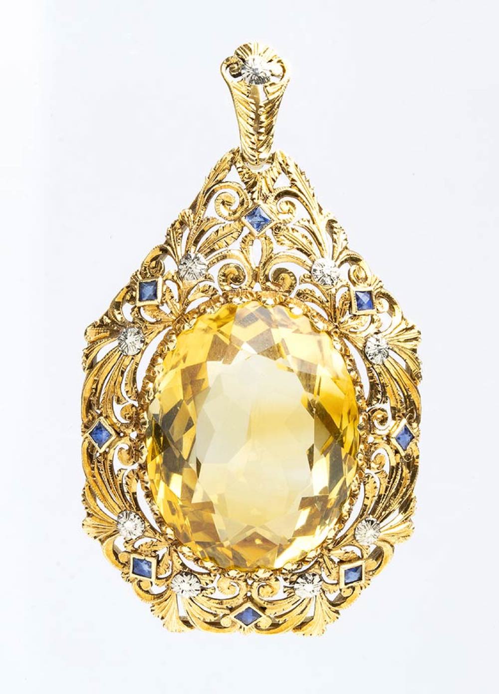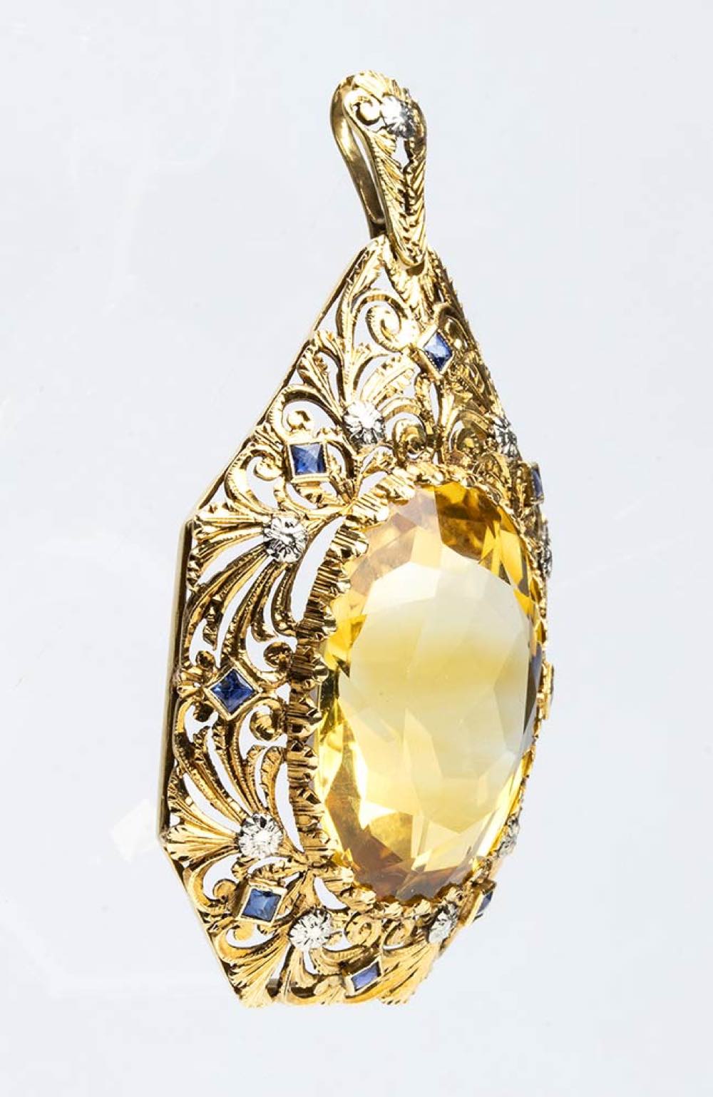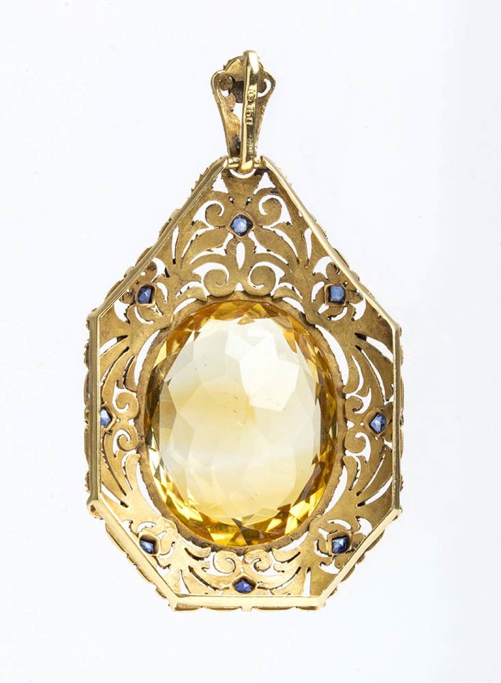 Pendente in oro con quarzo citrino e zaffiri