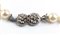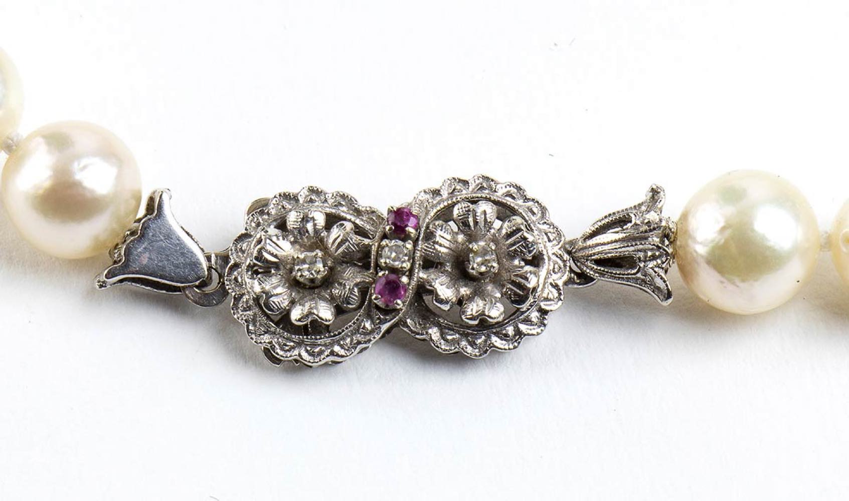 oro bianco 18k, ad un filo di perle coltivate d'acqua salata, fermezza con motivo di fiori e nastri decorata con 2 rubini e 3 diamanti rotondi taglio huit-huit 0,06 ct circa, H, VS. Punzonata "750".