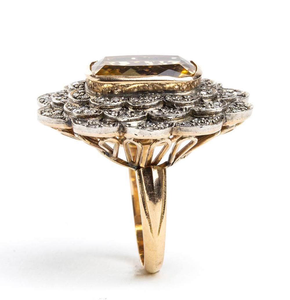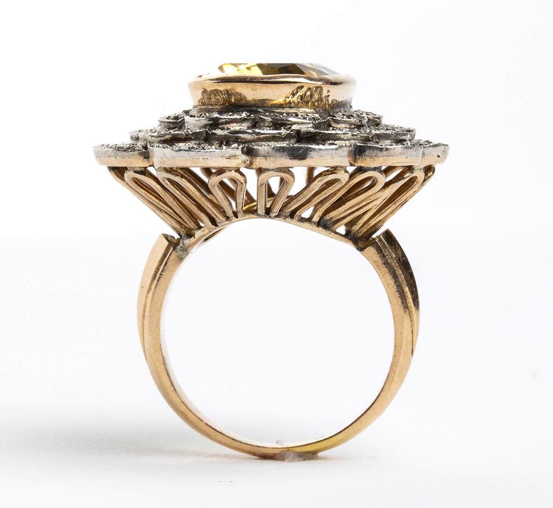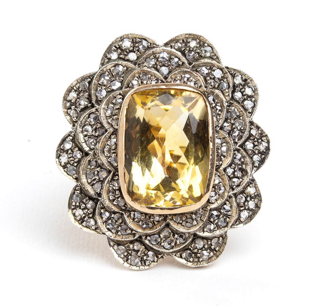 Lotto 219 | Anello a fiore in oro giallo ed argento con quarzo citrino e diamanti taglio a rosa