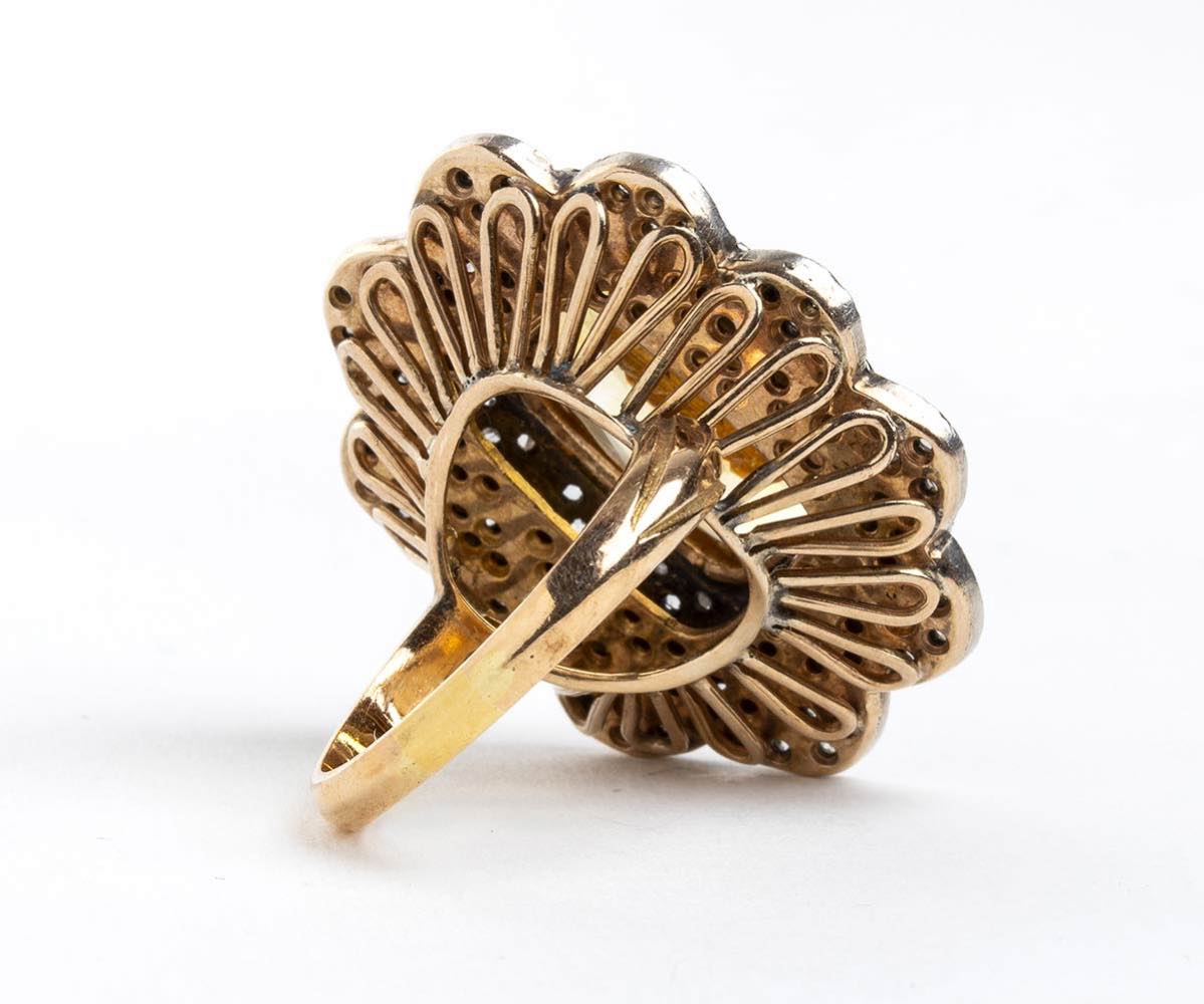 Anello a fiore in oro giallo ed argento con quarzo citrino e diamanti taglio a rosa