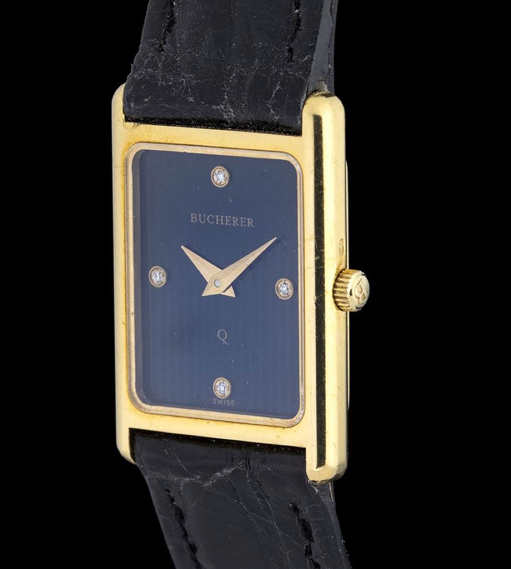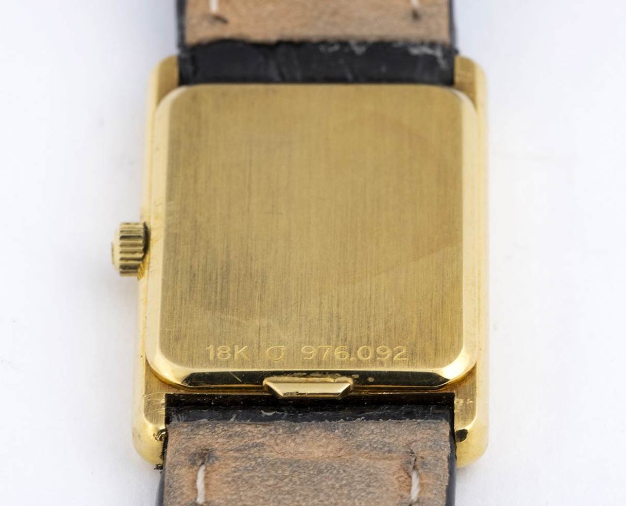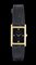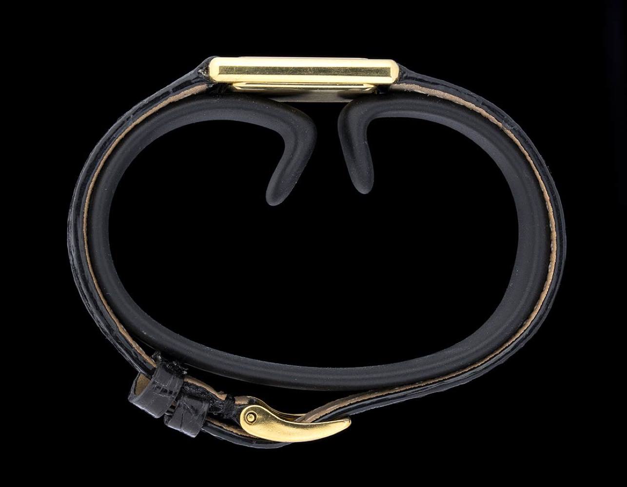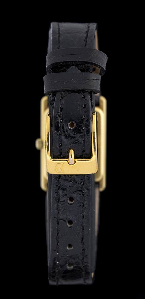 cassa rettangolare in oro giallo 18k, quadrante nero con diamanti alle ore 3-6-9-12, movimento al quarzo. Dimensioni cassa: 17,5 x 25,5 mm (corona esclusa). Bracciale in pelle. Il fondello esterno presenta la scritta: 8377 10 976092 18k.