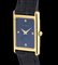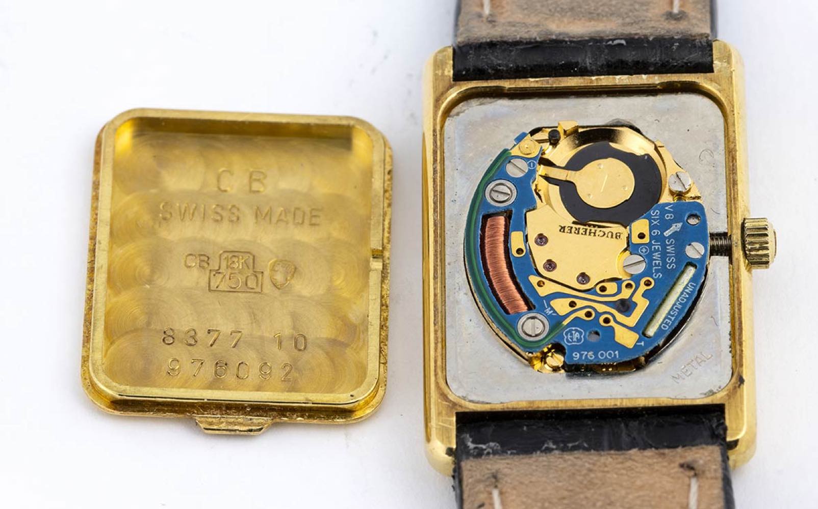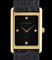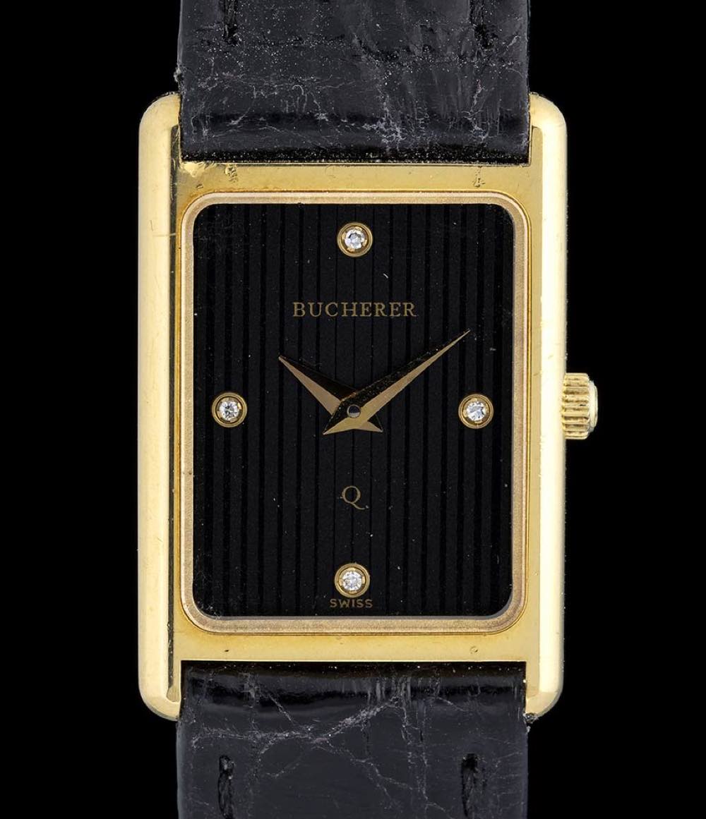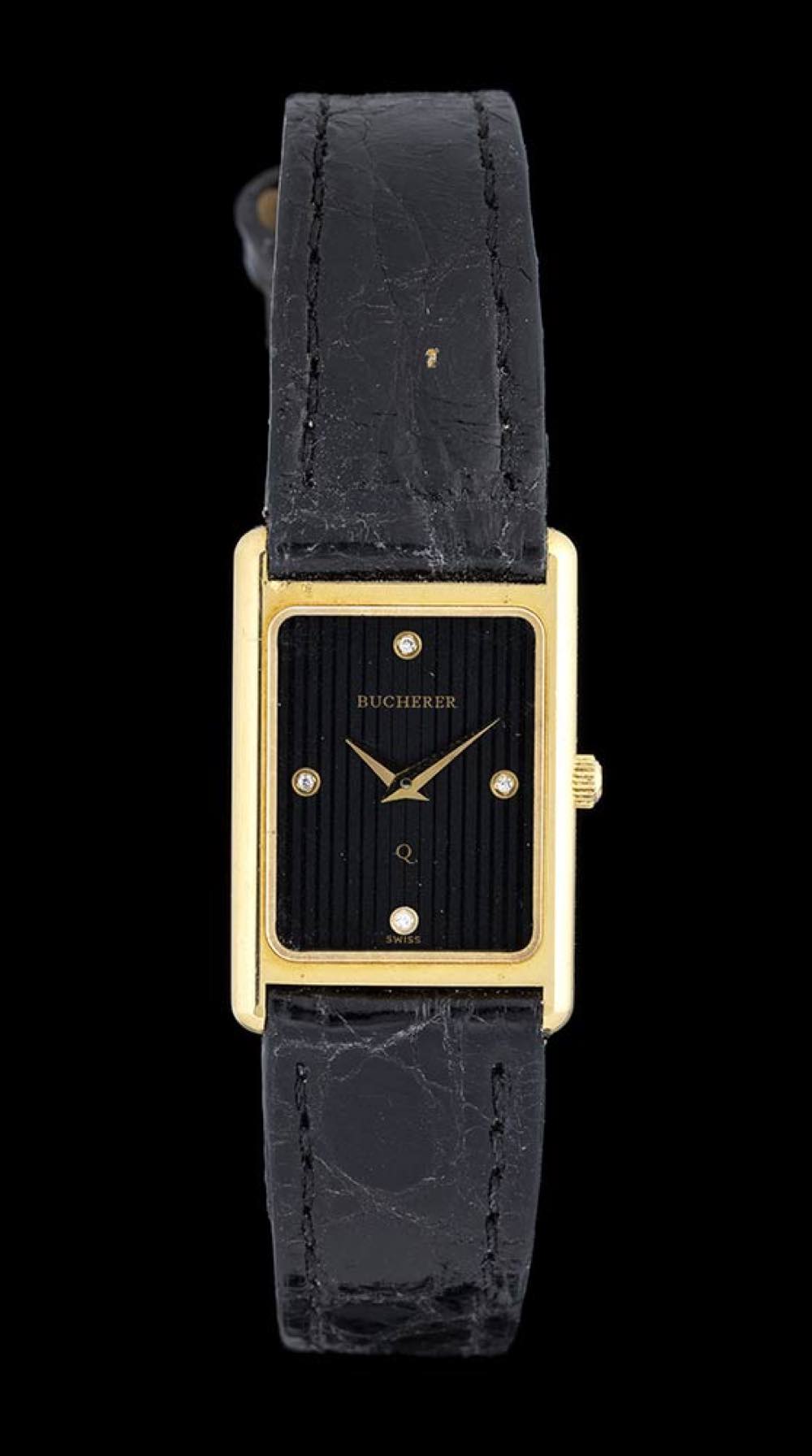 cassa rettangolare in oro giallo 18k, quadrante nero con diamanti alle ore 3-6-9-12, movimento al quarzo. Dimensioni cassa: 17,5 x 25,5 mm (corona esclusa). Bracciale in pelle. Il fondello esterno presenta la scritta: 8377 10 976092 18k.