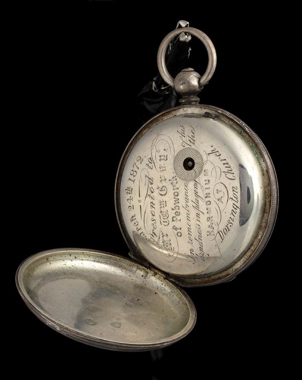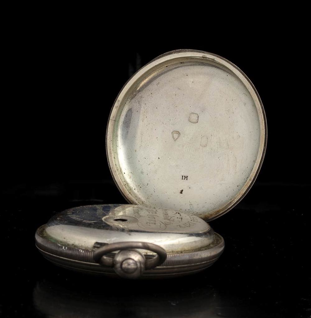 doppia cassa in argento 925/1000 decorata a guilloche punzonata Londra 1869-70; quadrante argentato con numeri romani e sfere in acciaio. Carica a remontair.