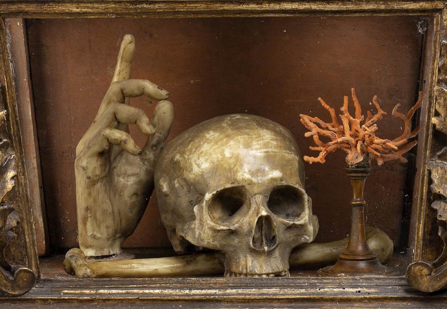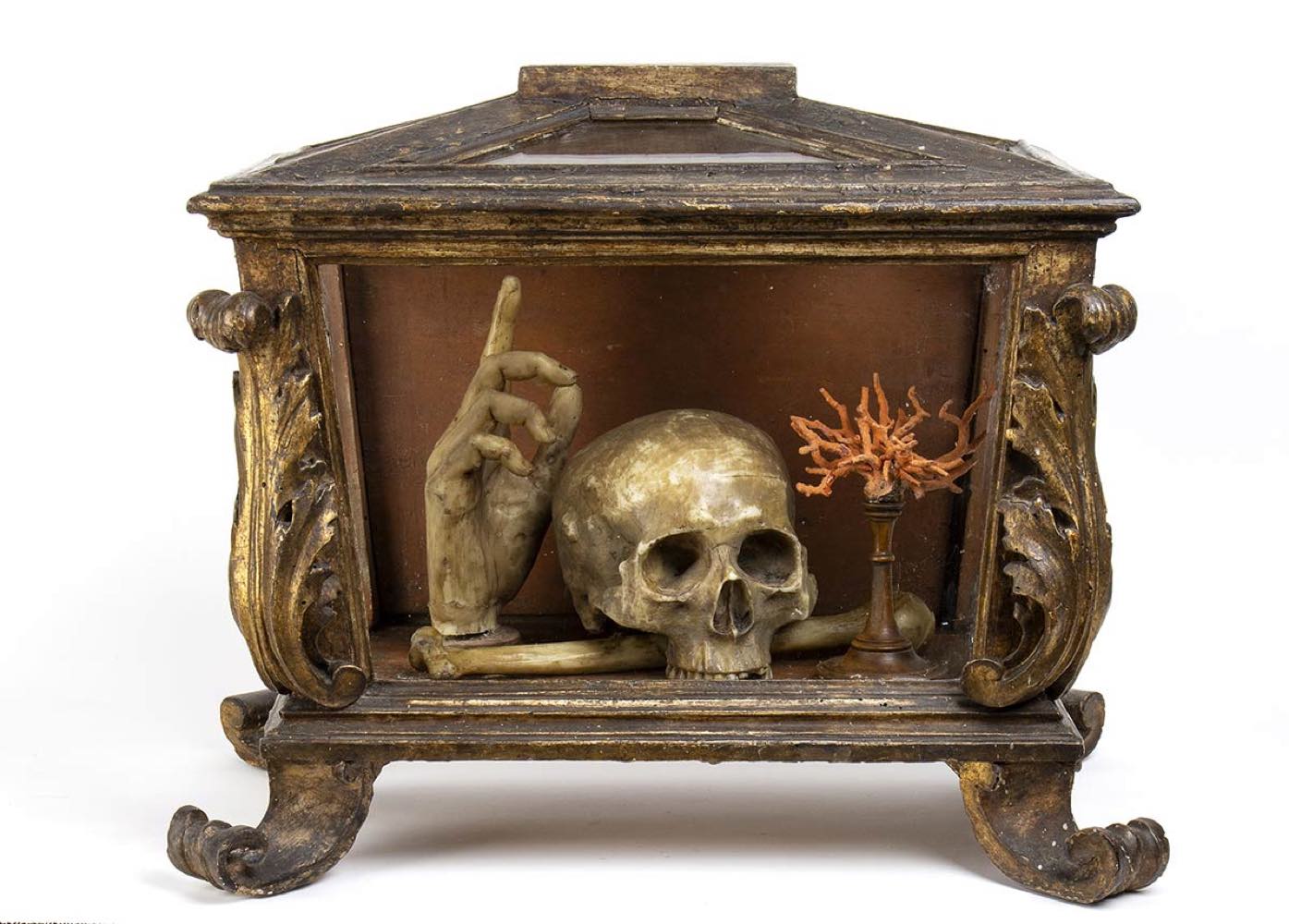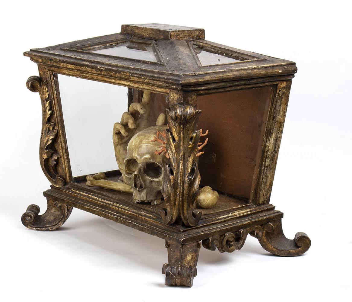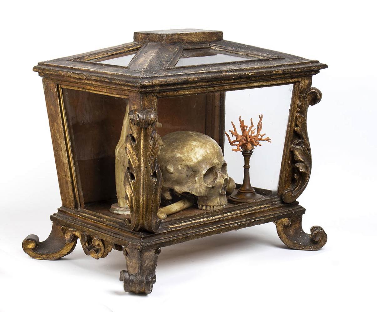 La scena nella teca si compone da un teschio a cui lati sorgono un rametto di corallo ed una mano con il dito indice che punta verso l’alto. Il significato di tale natura morta suggerisce nello spettatore la riflessione sull’inesorabile trascorrere del tempo ed anche sull’inutilità degli effimeri beni e piaceri terreni. L’iconografia perciò ha dei presupposti moraleggianti, finalizzati ad invitare i fruitori di occuparsi della più importante salvezza eterna. La teca rettangolare è composta da legno e vetro, decorata da foglie d’acanto negli angoli e quattro piedini fisiomorfi.