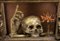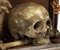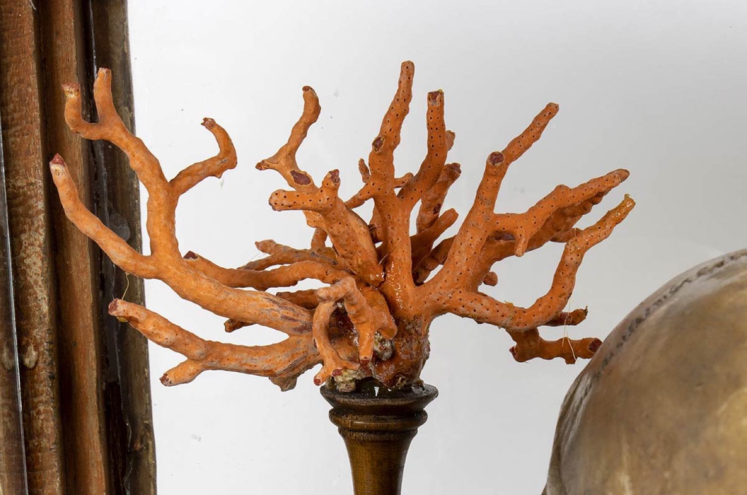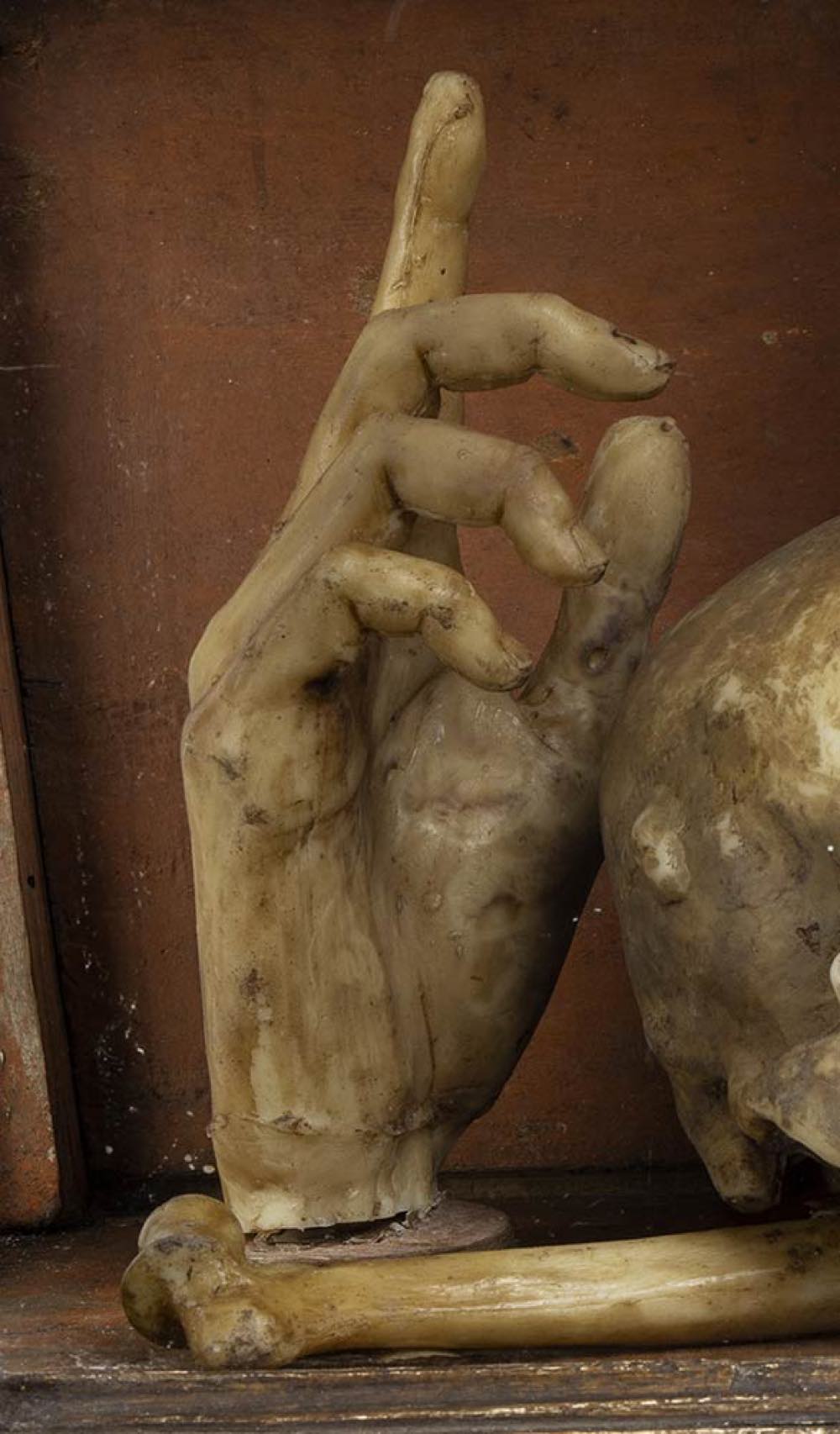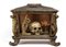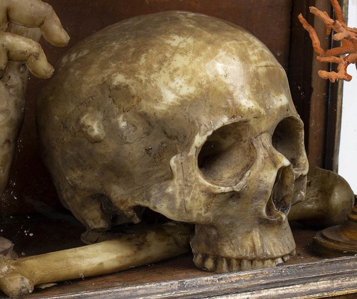 La scena nella teca si compone da un teschio a cui lati sorgono un rametto di corallo ed una mano con il dito indice che punta verso l’alto. Il significato di tale natura morta suggerisce nello spettatore la riflessione sull’inesorabile trascorrere del tempo ed anche sull’inutilità degli effimeri beni e piaceri terreni. L’iconografia perciò ha dei presupposti moraleggianti, finalizzati ad invitare i fruitori di occuparsi della più importante salvezza eterna. La teca rettangolare è composta da legno e vetro, decorata da foglie d’acanto negli angoli e quattro piedini fisiomorfi.