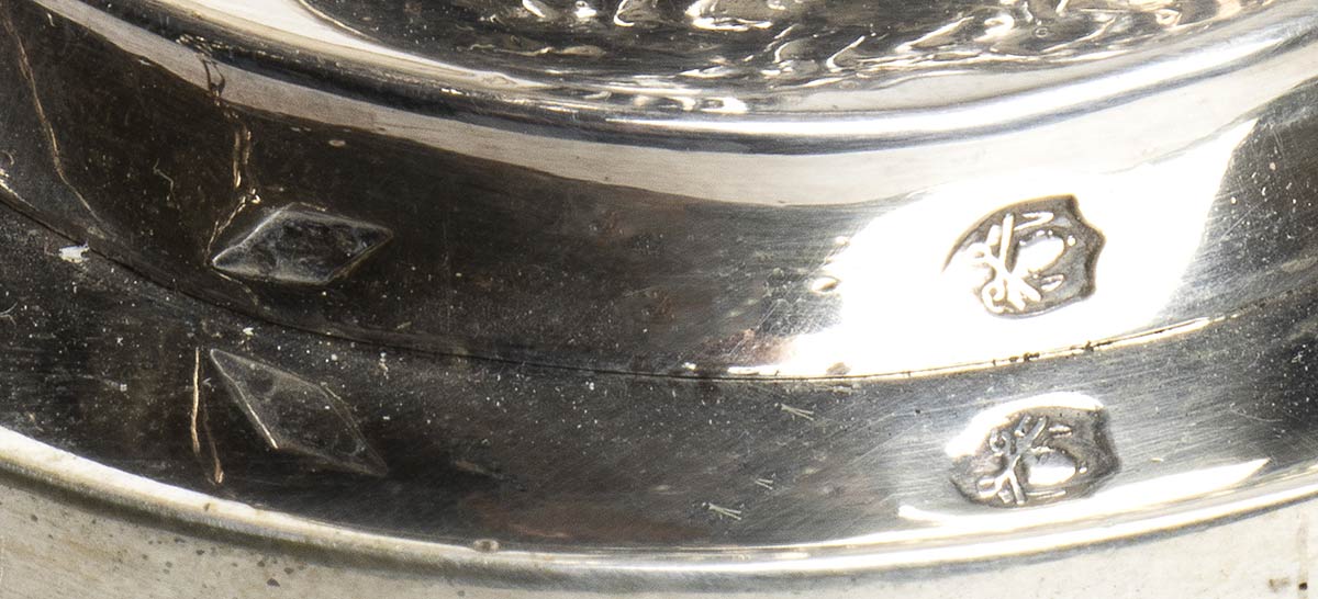 Punzonata con i marchi camerali in uso a Roma dopo il 1815 per l'argento al titolo a 10 once e 16 denari (889/1000) e con il marchio dell'argentiere "S25S".
