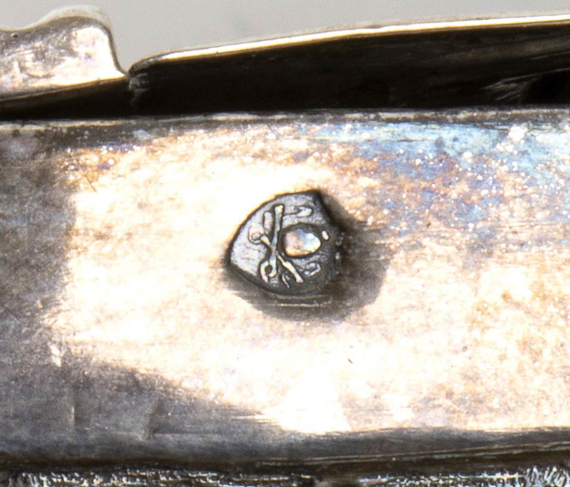 piede circolare su cui poggia il fusto a balaustro, corpo sbalzato e decorato a palmette, coperchio con rami d'ulivo. Punzonata con i marchi camerali in uso a Roma dopo il 1815 per l'argento al titolo a 10 once e 16 denari (889/1000).