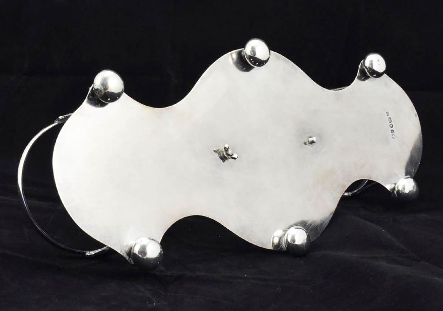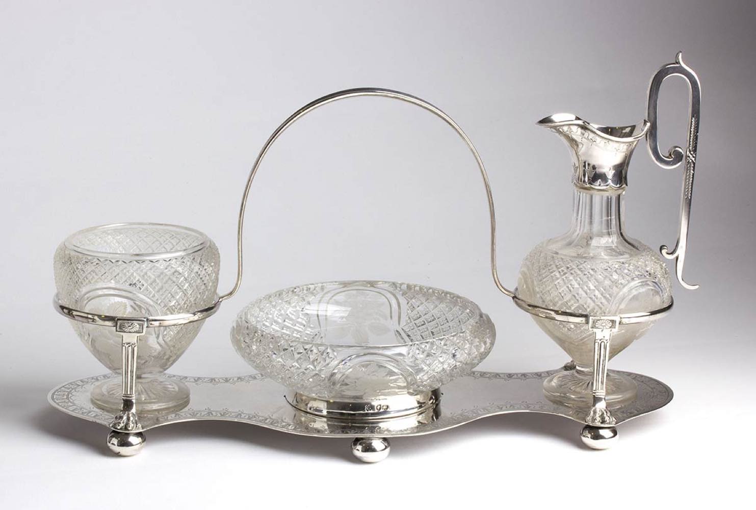 con piatto rimovibile in cristallo, lattiera e zuccheriera, il tutto inserito in un supporto in argento 925/1000 con maniglia per il trasporto. Serie completa di marchi Londra 1870-1871, argentieri Richard Martin & Ebenezer Hall - Martin Hall & Co.