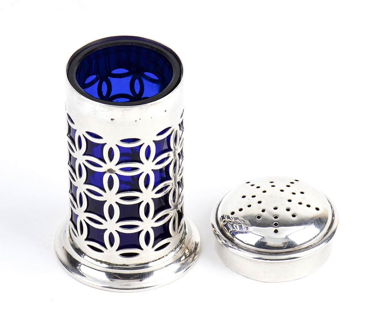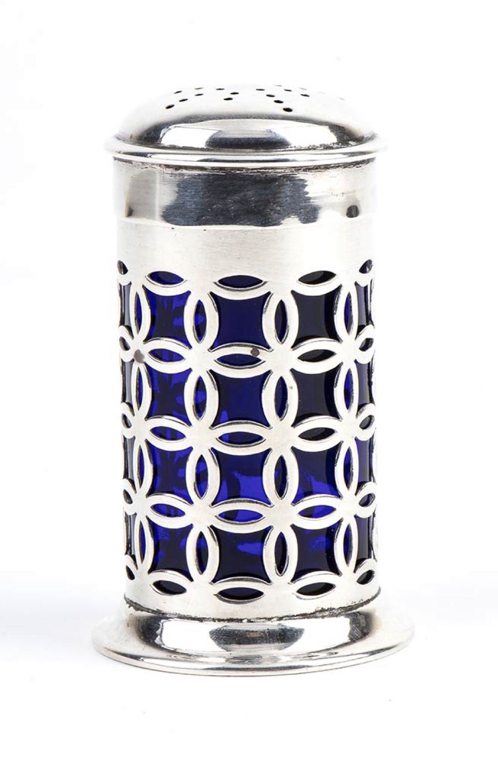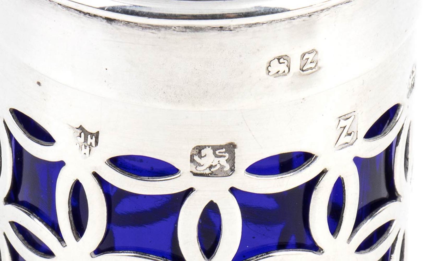 con bordo traforato a decori geometrici e contenitore in vetro blu. Argento 925/1000, serie completa di marchi Birmingham 1899-1900, argentieri Haseler Bros.