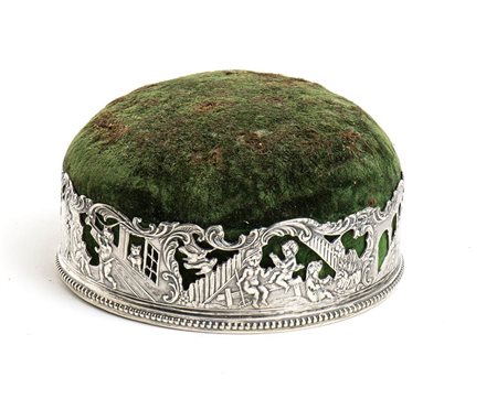 di forma circolare decorato con scene di putti. Argento 800/1000, punzonato con i marchi in uso in Germania dopo il 1888.