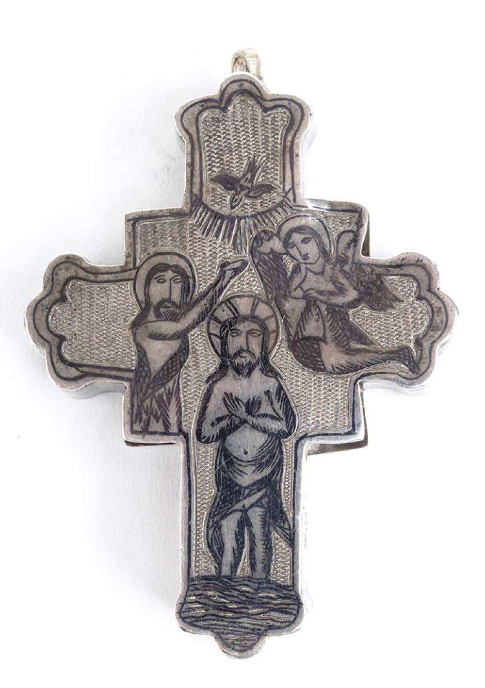 a) croce pendente in argento niellato; sul recto è rappresentata una Crocifissione mentre al verso troviamo il battesimo di Cristo. Punzonata con un marchio non identificato.