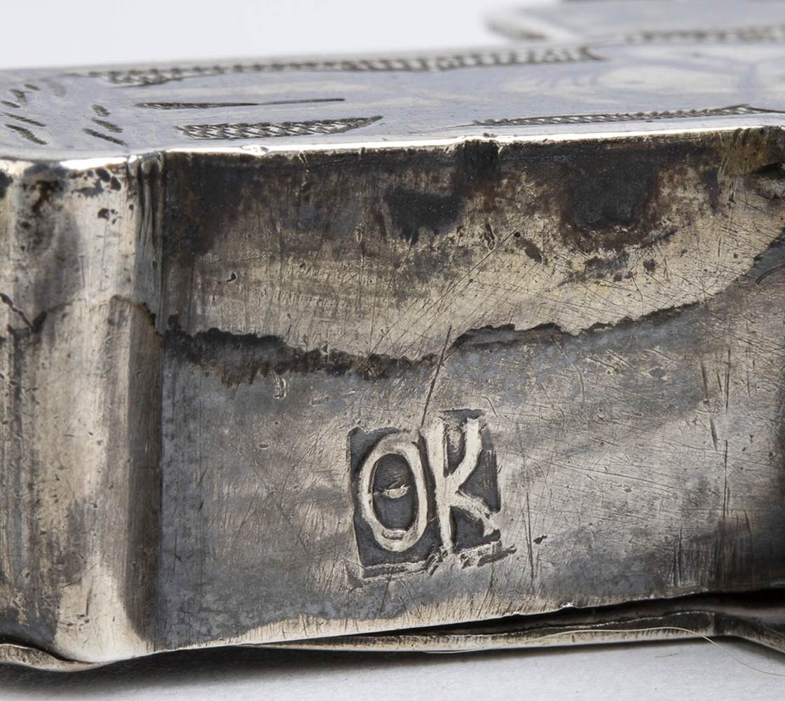 b) portasigarette in argento niellato. Argento 800/1000, Punzonato con il marchio "Testa di Diana" in uso a Vienna, Austria-Ungheria, tra il 1872 e il 1922.