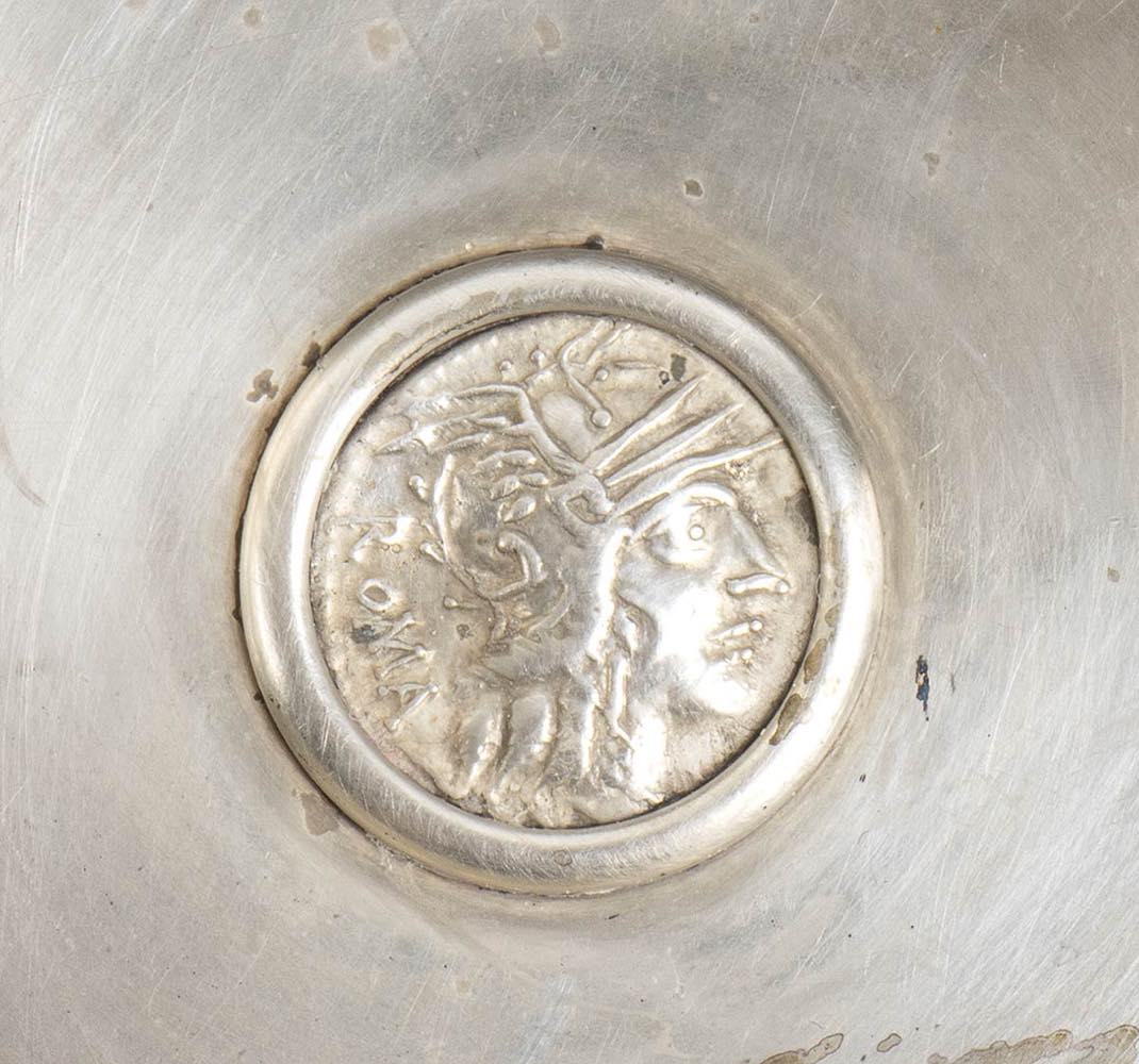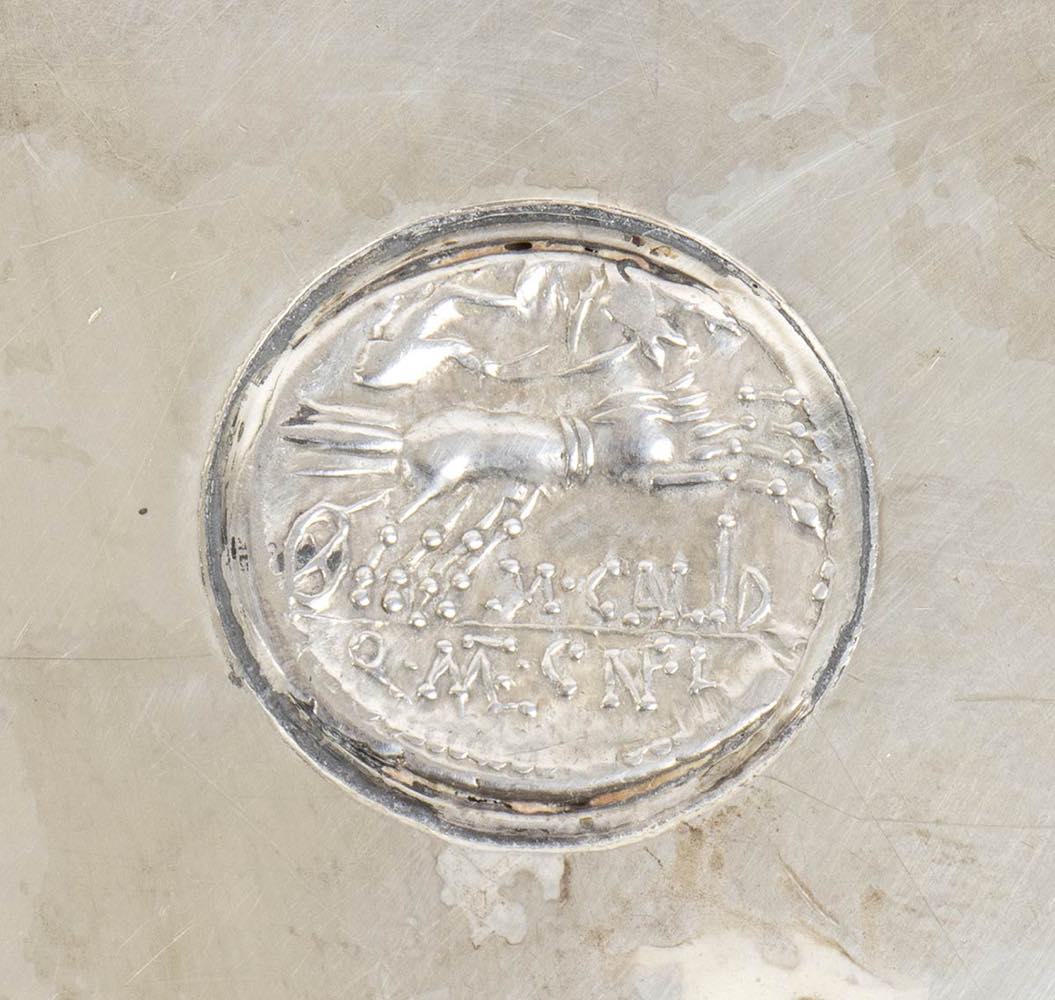 di forma circolare con presa traforata, il fondo incastonato con la seguente moneta: REPUBBLICA ROMANA, Denario CALIDIA. Marco Calidio. Circa 115 a.C. Testa di Roma a destra, e dietro ROMA. Vittoria su biga, sotto M.CALID e in esergo Q.MET.CN.FL." Argento 925/1000, punzonato "925 - BVLGARI".