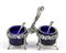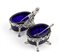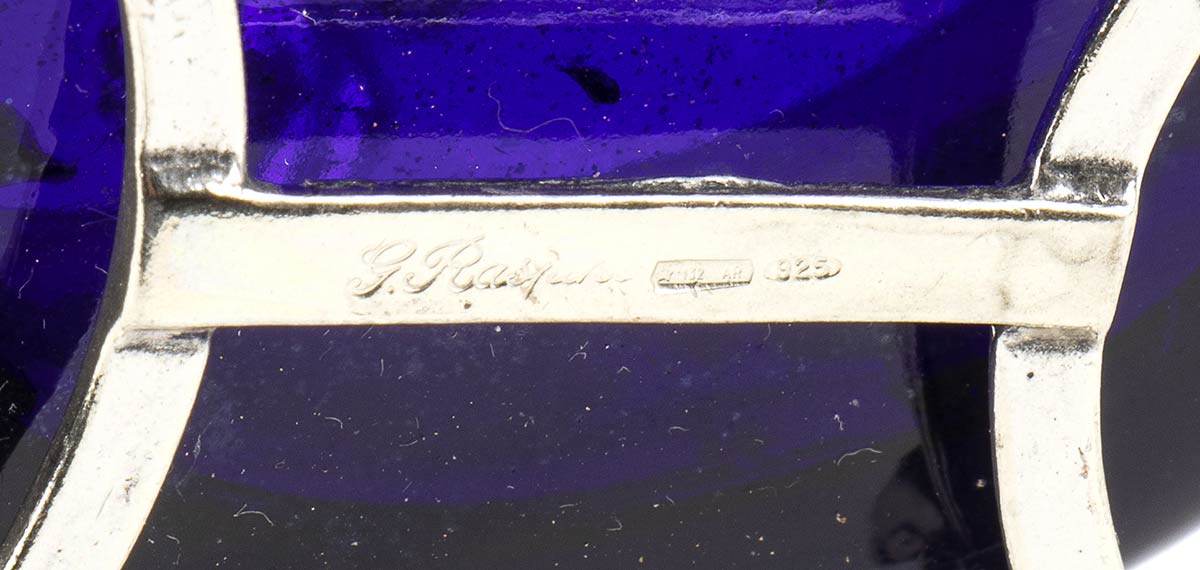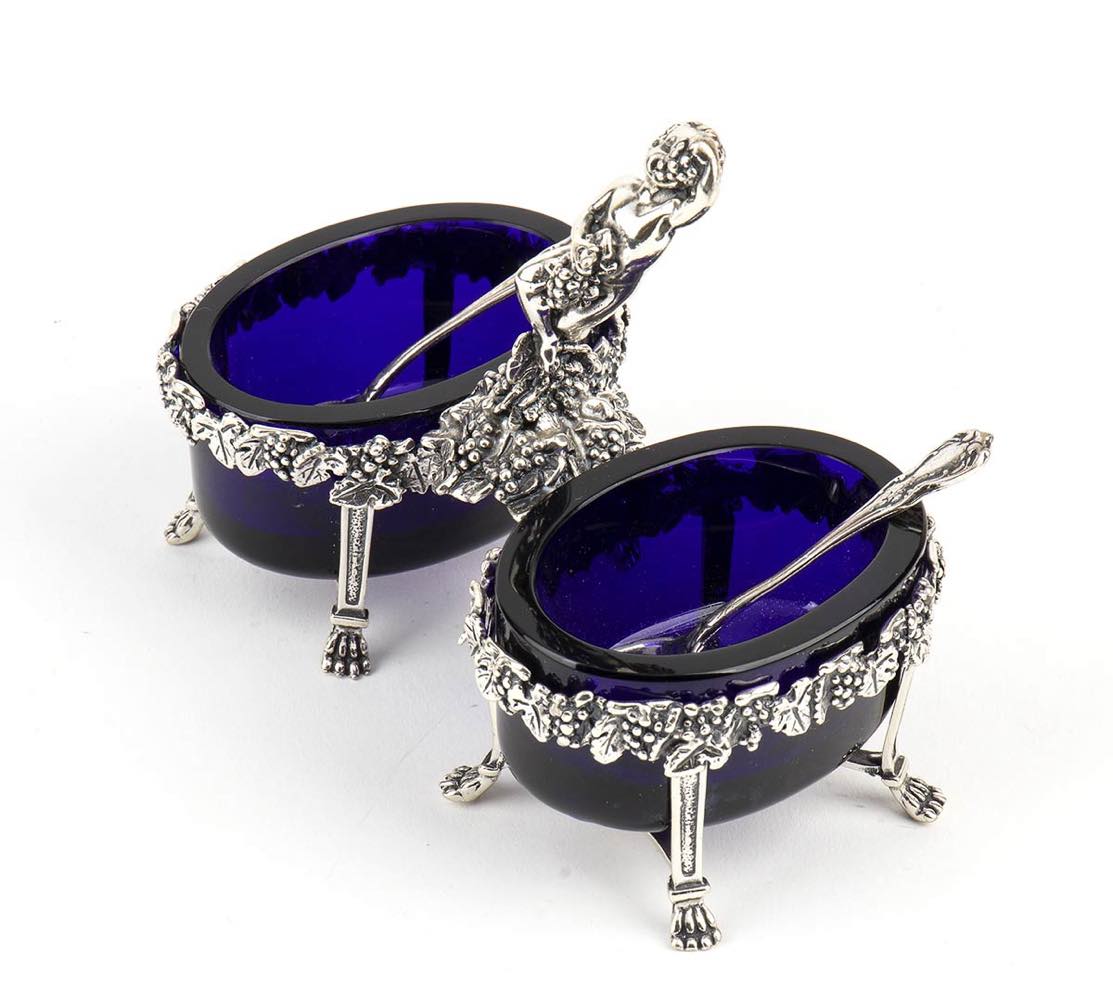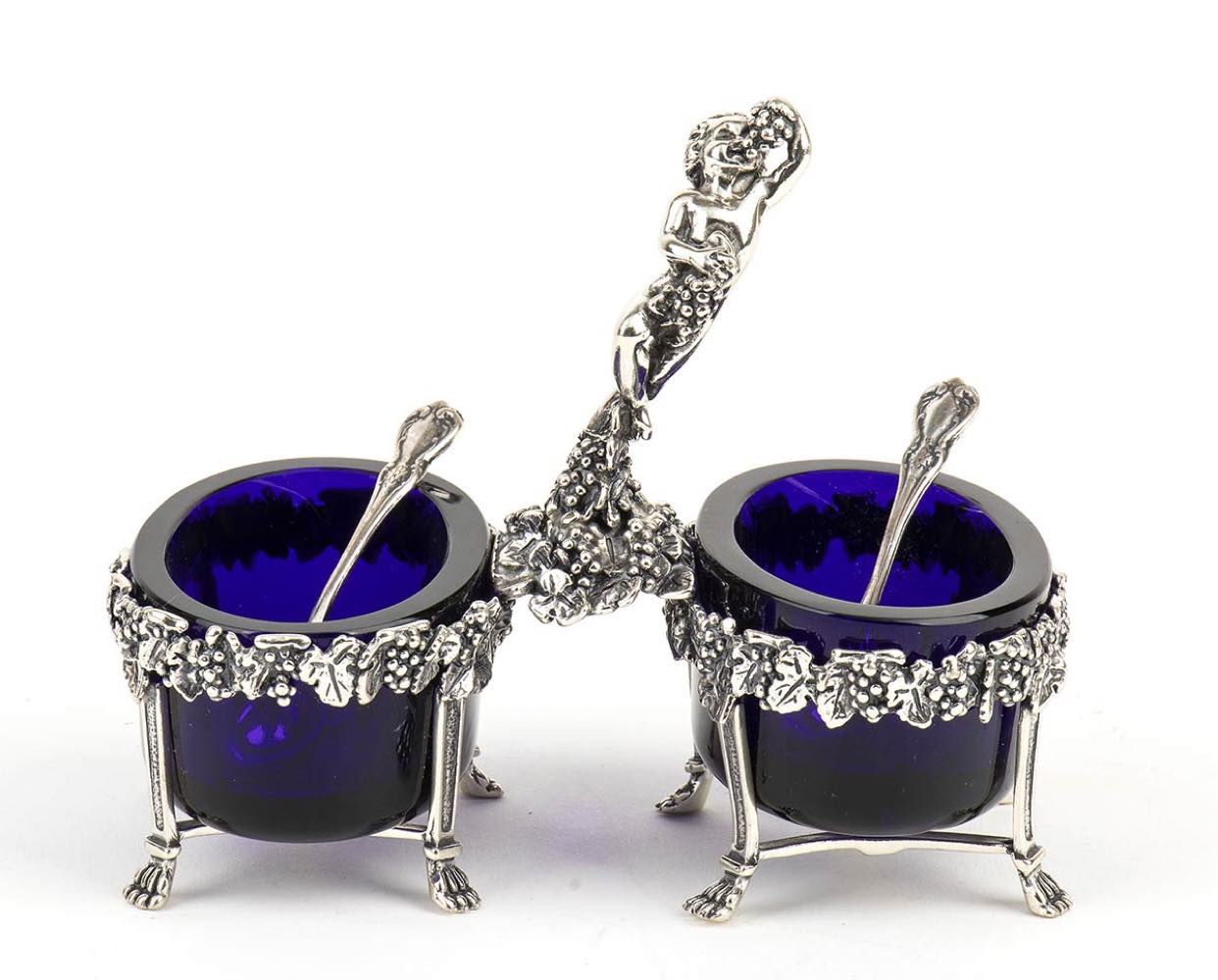 a due vasche con contenitori in vetro blu, interamente decorata con tralci di vite con uva e pampini; poggiante su piedi ferini con presa centrale a forma di putto. Corredata da cucchiaini. Argento 925/1000, firmata "G. Raspini" e punzonata "* 132 AR" e "925"