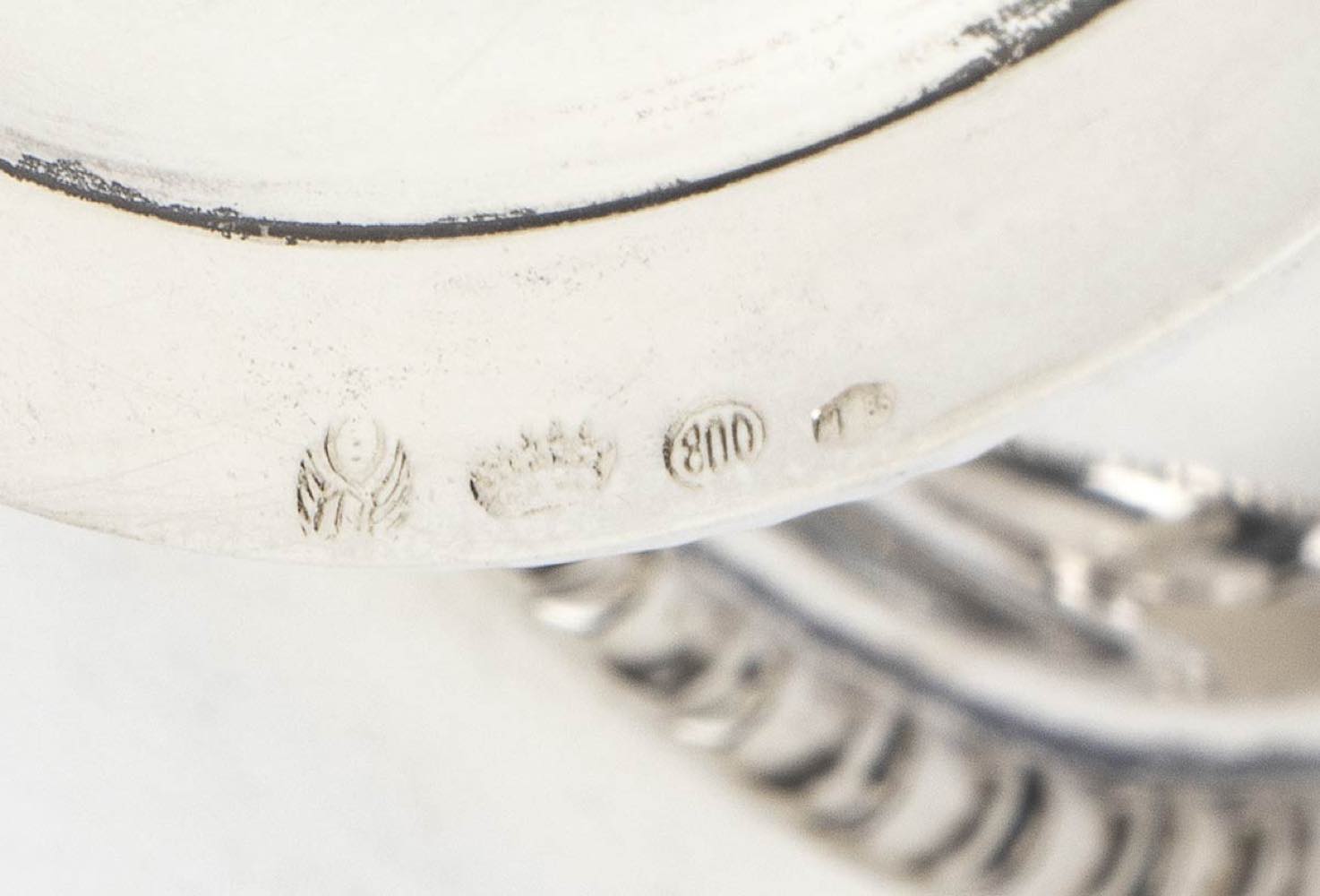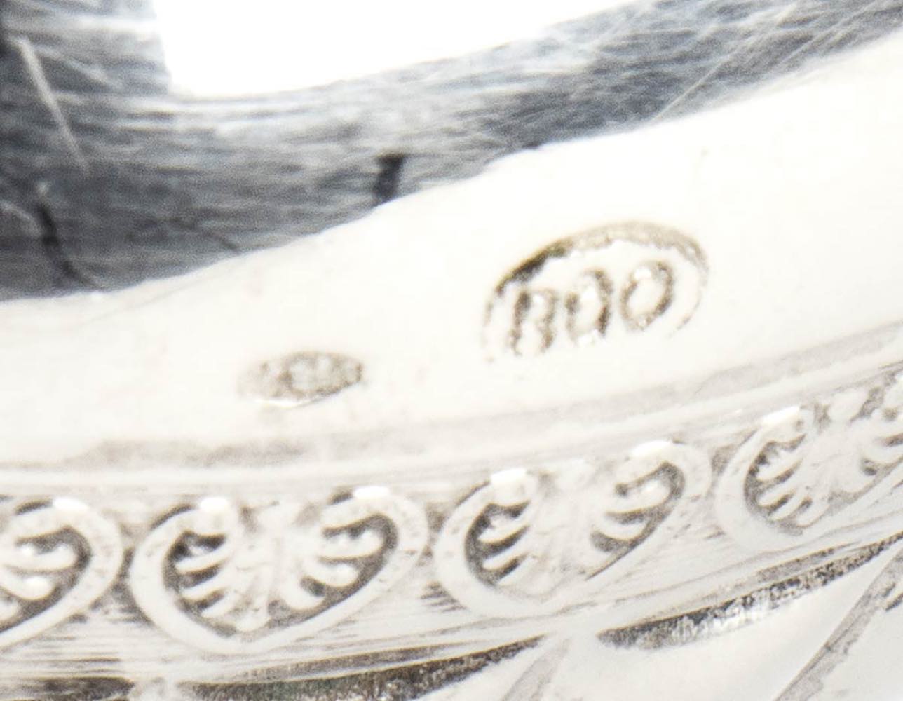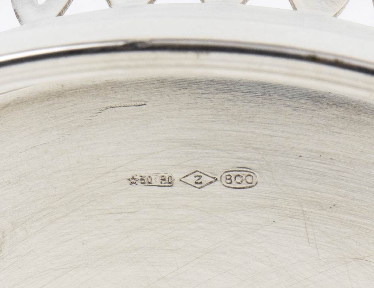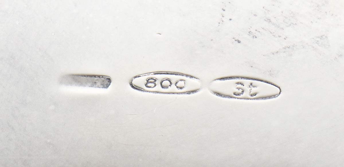b) cestino rotondo in argento 800/1000 punzonato "800" e "1 BS", diametro 18,2 cm, altezza 6,2 cm, peso 188 gr;