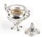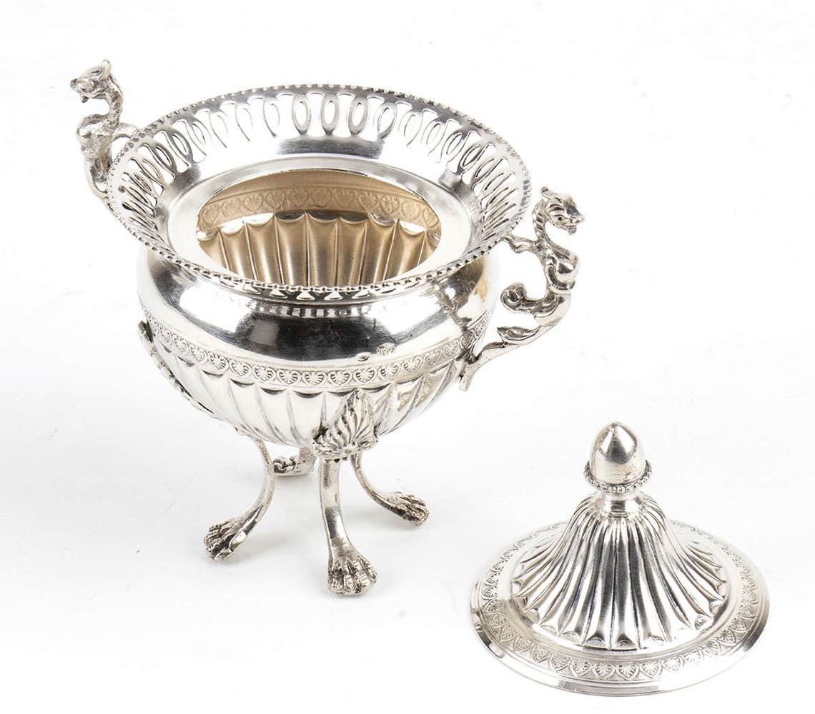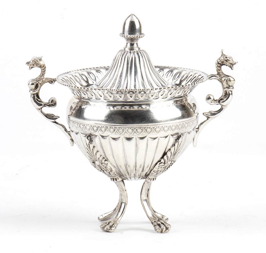 f) zuccheriera in argento 800/1000 punzonata "800", altezza 11,5 cm, diametro con manici 11 cm, peso 172 gr.